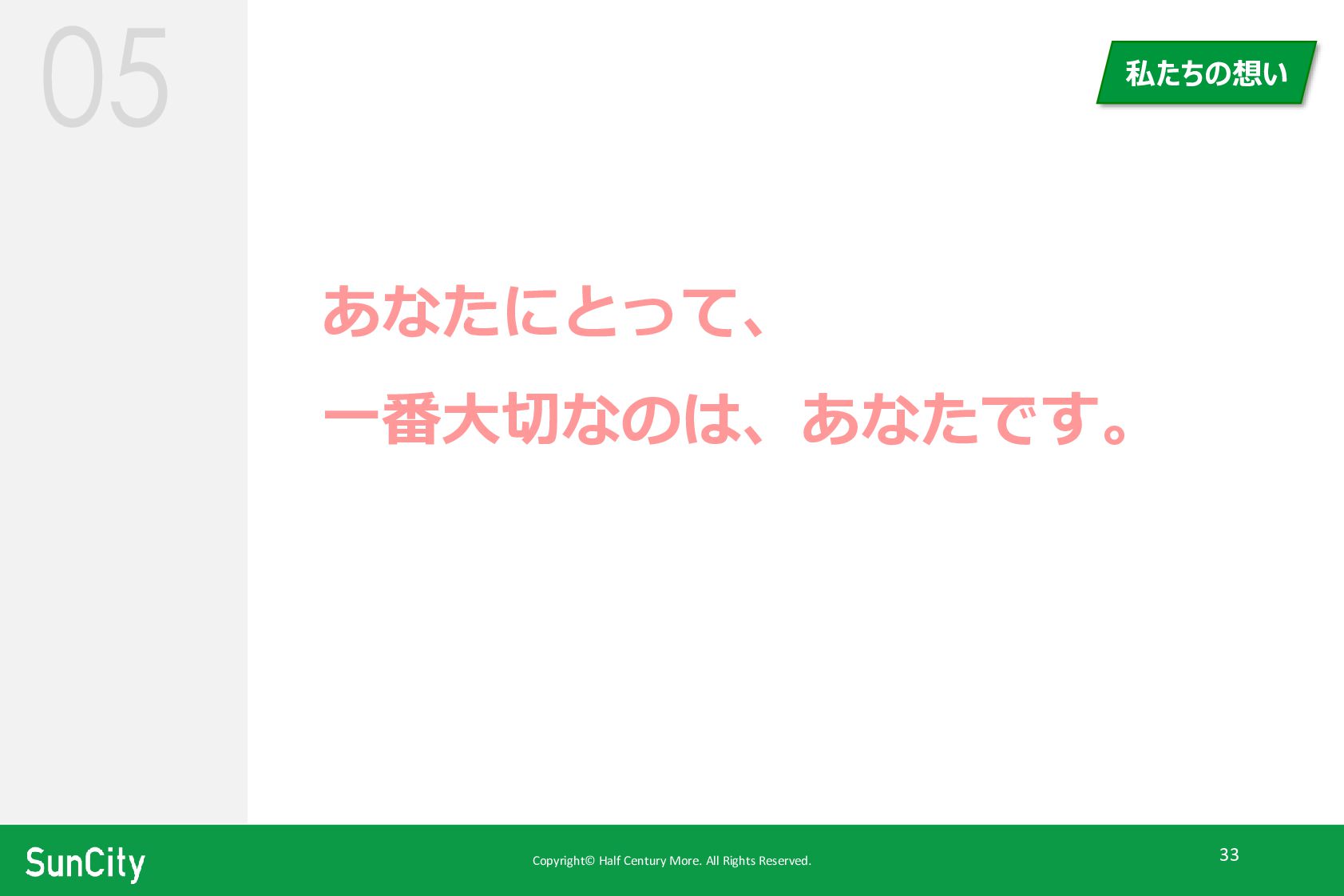 Copyright© Half Century More. All Rights Reserved. 33 あなたにとって、 一番大切なのは、あなたです。