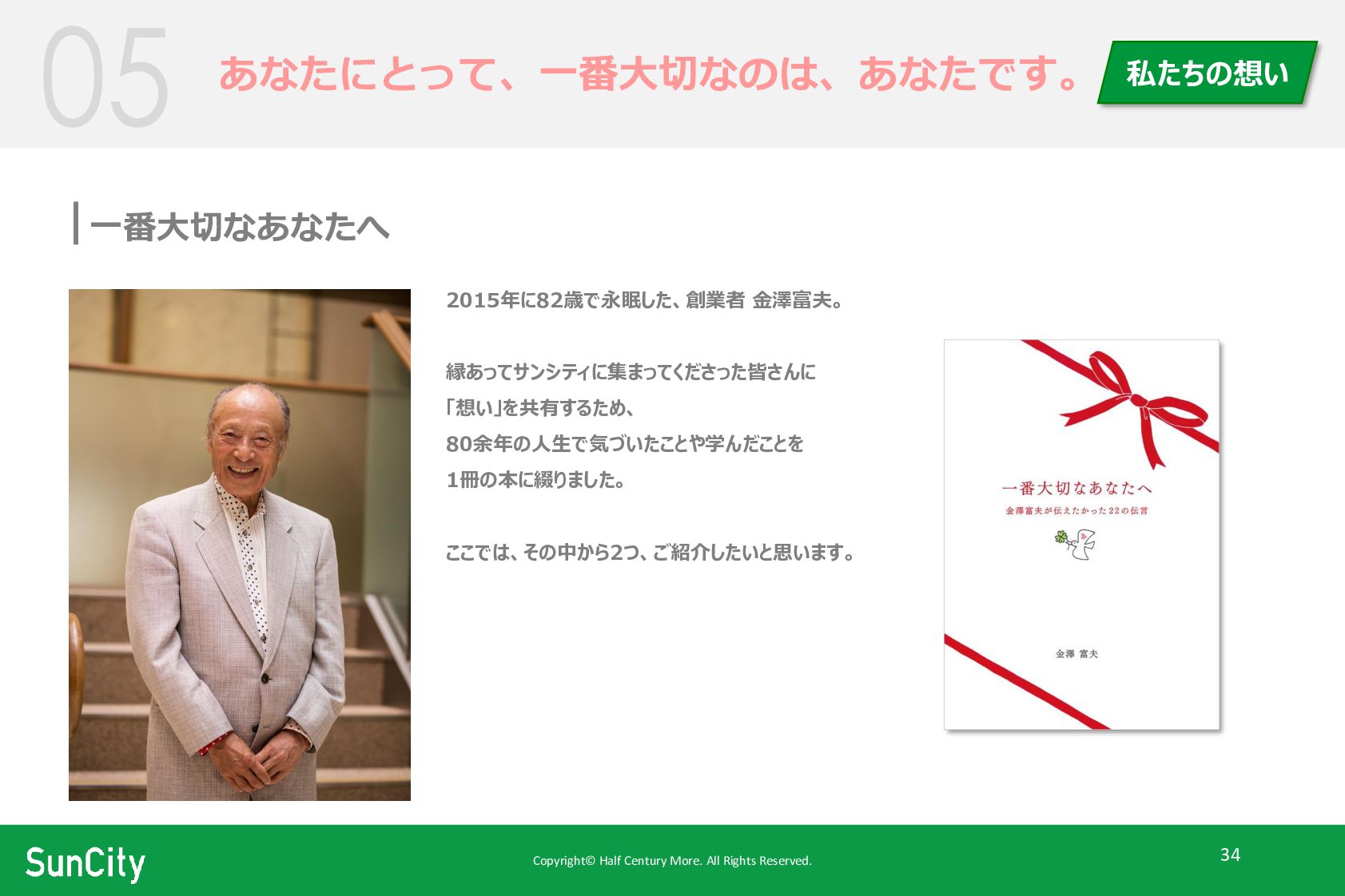 Copyright© Half Century More. All Rights Reserved. 34 あなたにとって、一番大切なのは、あなたです。 一番大切なあなたへ