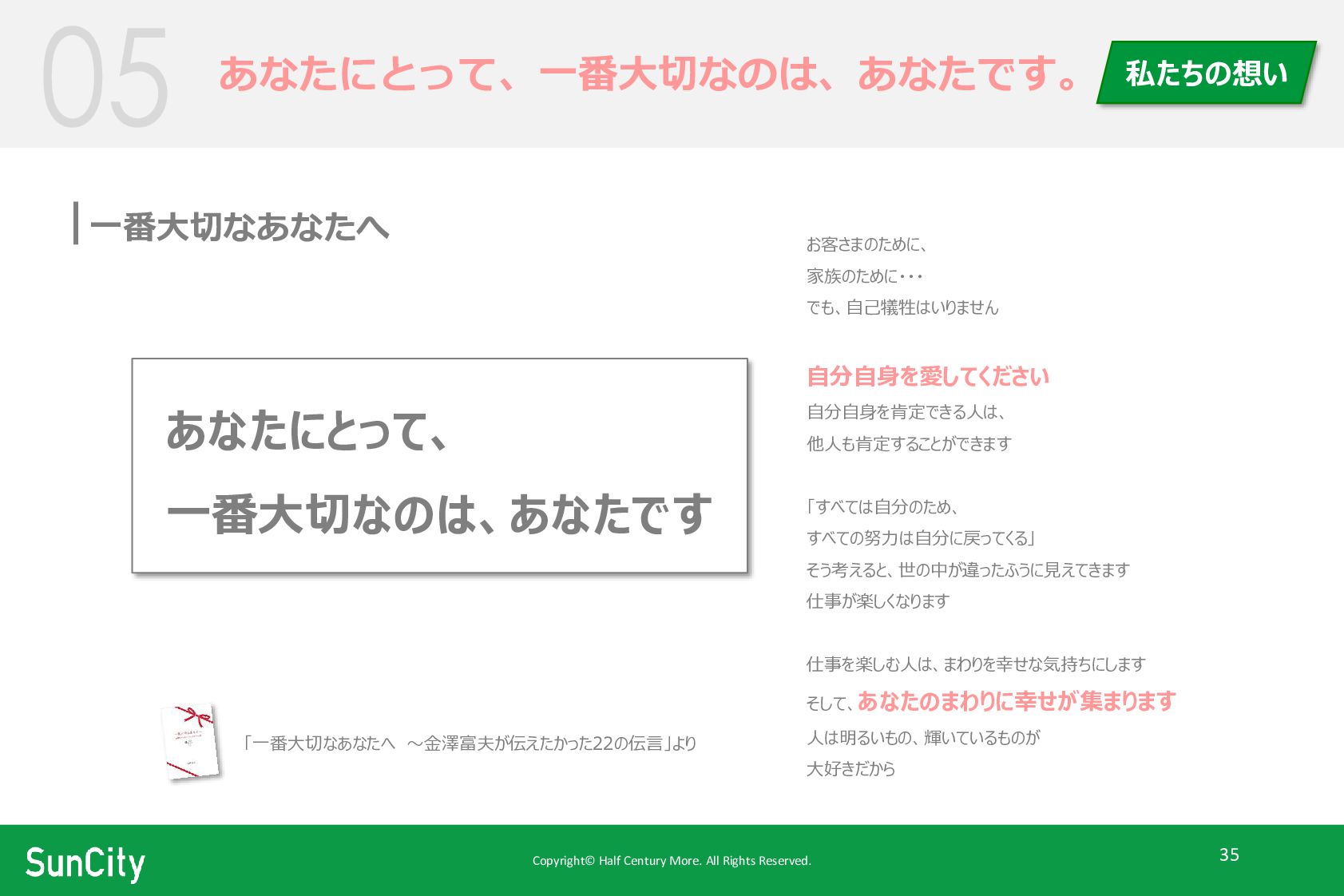Copyright© Half Century More. All Rights Reserved. 35 あなたにとって、一番大切なのは、あなたです。 一番大切なあなたへ