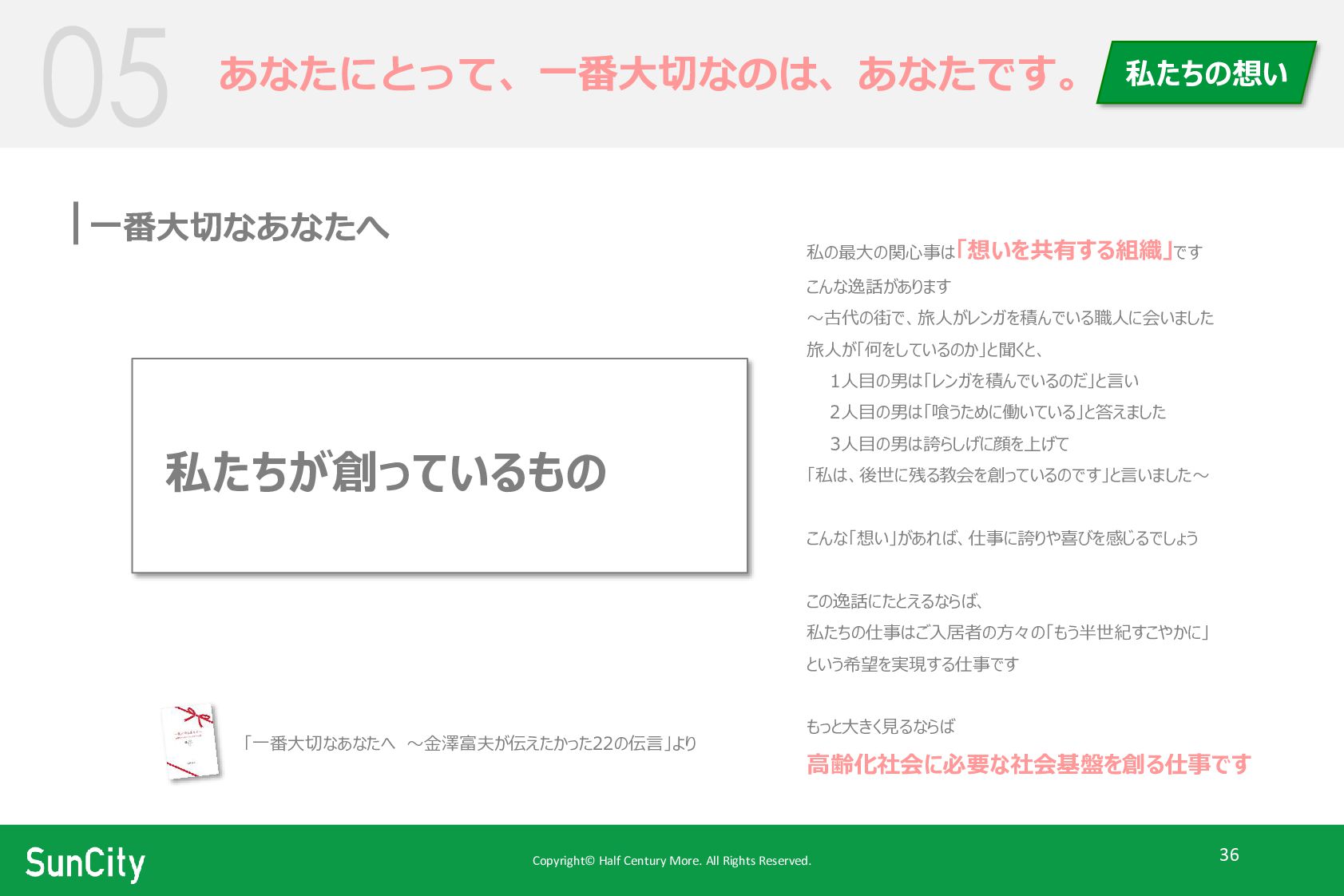 私の最大の関心事は「想いを共有する組織」です こんな逸話があります ~古代の街で、旅人がレンガを積んでいる職人に会いました 旅人が「何をしているのか」と聞くと、 1人目の男は「レンガを積んでいるのだ」と言い 2人目の男は「喰うために働いている」と答えました 3人目の男は誇らしげに顔を上げて 「私は、後世に残る教会を創っているのです」と言いました~ こんな「想い」があれば、仕事に誇りや喜びを感じるでしょう この逸話にたとえるならば、 私たちの仕事はご入居者の方々の「もう半世紀すこやかに」 という希望を実現する仕事です もっと大きく見るならば 高齢化社会に必要な社会基盤を創る仕事です 私たちの想い 「一番大切なあなたへ ~金澤富夫が伝えたかった22の伝言」より 私たちが創っているもの