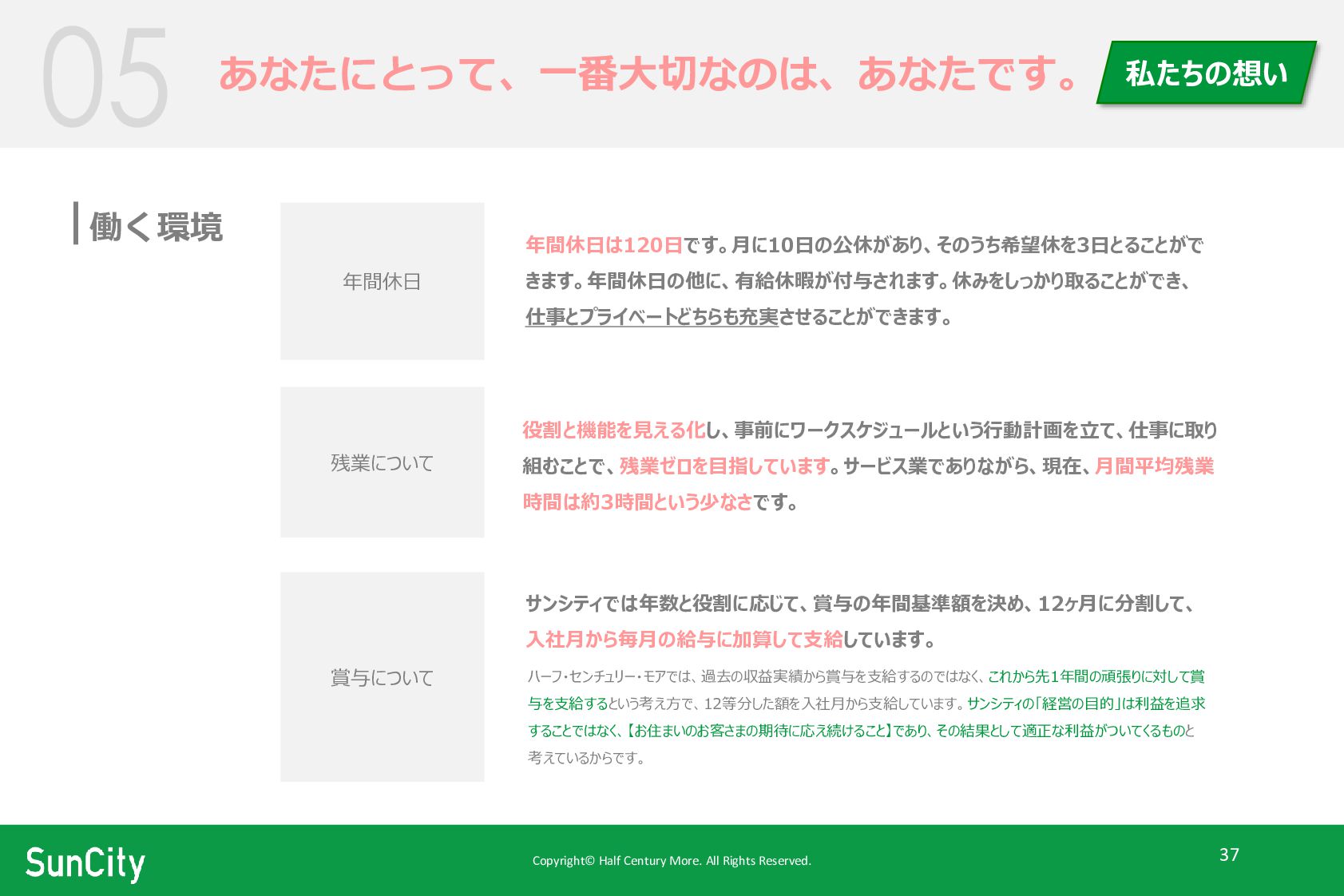 年間休日は120日です。月に10日の公休があり、そのうち希望休を3日とることがで きます。年間休日の他に、有給休暇が付与されます。休みをしっかり取ることができ、 仕事とプライベートどちらも充実させることができます。 残業について 賞与について 役割と機能を見える化し、事前にワークスケジュールという行動計画を立て、仕事に取り 組むことで、残業ゼロを目指しています。サービス業でありながら、現在、月間平均残業 時間は約3時間という少なさです。 サンシティでは年数と役割に応じて、賞与の年間基準額を決め、12ヶ月に分割して、 入社月から毎月の給与に加算して支給しています。 ハーフ・センチュリー・モアでは、過去の収益実績から賞与を支給するのではなく、これから先1年間の頑張りに対して賞 与を支給するという考え方で、12等分した額を入社月から支給しています。サンシティの「経営の目的」は利益を追求 することではなく、【お住まいのお客さまの期待に応え続けること】であり、その結果として適正な利益がついてくるものと 考えているからです。 あなたにとって、一番大切なのは、あなたです。 私たちの想い