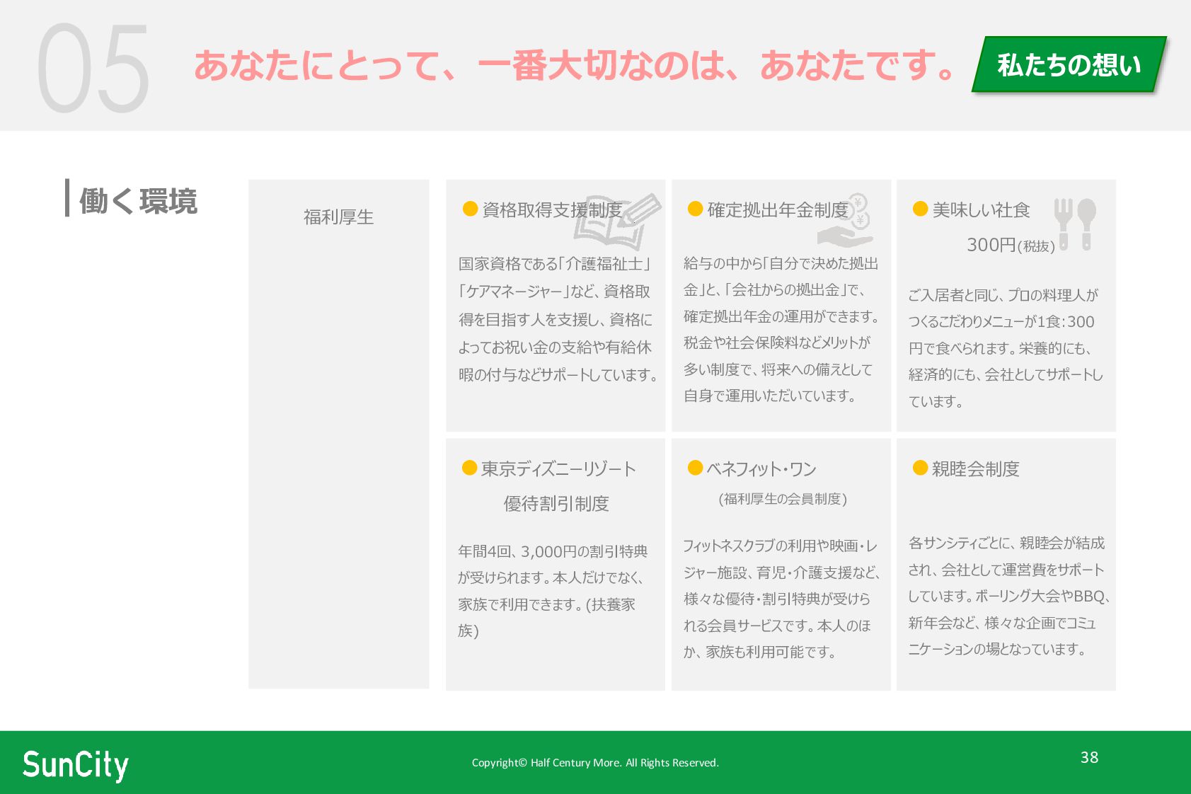 •資格取得支援制度 国家資格である「介護福祉士」 「ケアマネージャー」など、資格取 得を目指す人を支援し、資格に よってお祝い金の支給や有給休 暇の付与などサポートしています。 •東京ディズニーリゾート 優待割引制度 年間4回、3,000円の割引特典 が受けられます。本人だけでなく、 家族で利用できます。(扶養家 族) •ベネフィット・ワン (福利厚生の会員制度) フィットネスクラブの利用や映画・レ ジャー施設、育児・介護支援など、 様々な優待・割引特典が受けら れる会員サービスです。本人のほ か、家族も利用可能です。 •親睦会制度 各サンシティごとに、親睦会が結成 され、会社として運営費をサポート しています。ボーリング大会やBBQ、 新年会など、様々な企画でコミュ ニケーションの場となっています。 •確定拠出年金制度 給与の中から「自分で決めた拠出 金」と、「会社からの拠出金」で、 確定拠出年金の運用ができます。 税金や社会保険料などメリットが 多い制度で、将来への備えとして 自身で運用いただいています。 •美味しい社食 300円(税抜) ご入居者と同じ、プロの料理人が つくるこだわりメニューが1食:300 円で食べられます。栄養的にも、 経済的にも、会社としてサポートし ています。 あなたにとって、一番大切なのは、あなたです。 私たちの想い