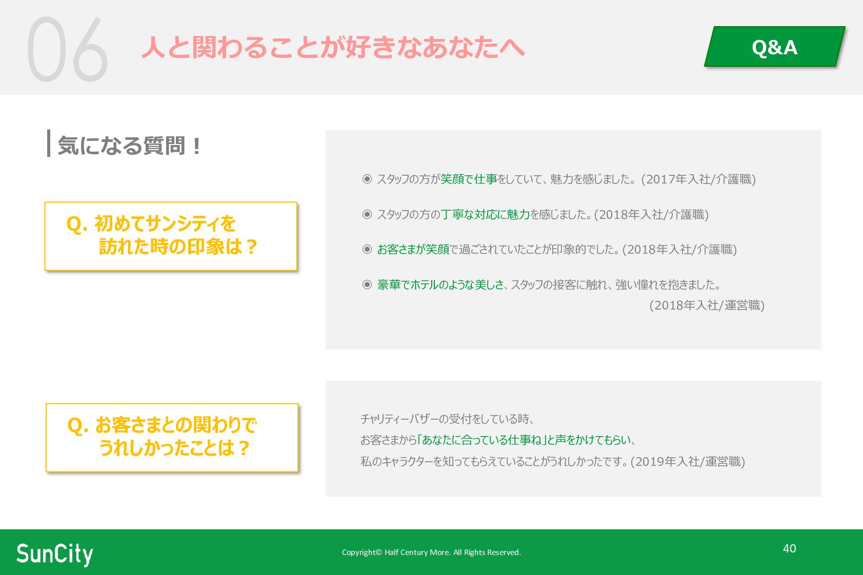 Q&A Q. 初めてサンシティを 訪れた時の印象は? チャリティーバザーの受付をしている時、 お客さまから「あなたに合っている仕事ね」と声をかけてもらい、 私のキャラクターを知ってもらえていることがうれしかったです。(2019年入社/運営職) Q. お客さまとの関わりで うれしかったことは? ◉ スタッフの方が笑顔で仕事をしていて、魅力を感じました。 (2017年入社/介護職) ◉ スタッフの方の丁寧な対応に魅力を感じました。(2018年入社/介護職) ◉ お客さまが笑顔で過ごされていたことが印象的でした。(2018年入社/介護職) ◉ 豪華でホテルのような美しさ、スタッフの接客に触れ、強い憧れを抱きました。 (2018年入社/運営職)