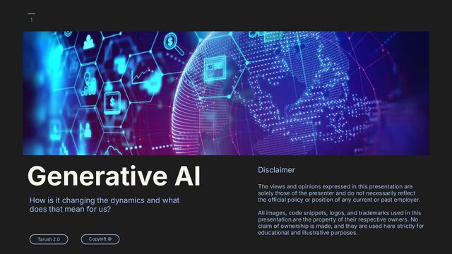 expressed in this presentation are solely those of the presenter and do not necessarily reflect the official policy or position of any current or past employer. All images, code snippets, logos, and trademarks used in this presentation are the property of their respective owners. No claim of ownership is made, and they are used here strictly for educational and illustrative purposes. Generative AI How is it changing the dynamics and what does that mean for us?