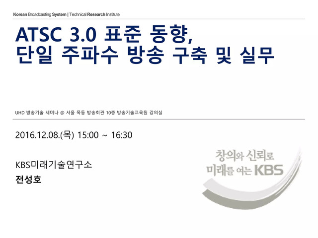 161208 ATSC3.0 표준 동향, 단일 주파수 방송 구축 및 실무 @ 한국방송기술인연합회