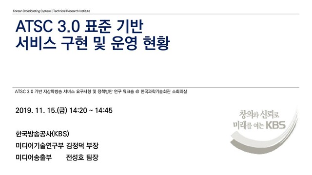 ATSC 3.0 기반 지상파방송 서비스 요구사항 및 정책방안 연구 워크숍 ------------------------------------------------------------------------ 2019. 11. 15.(금) 14:20 ~ 14:45 한국과학기술회관 소회의실