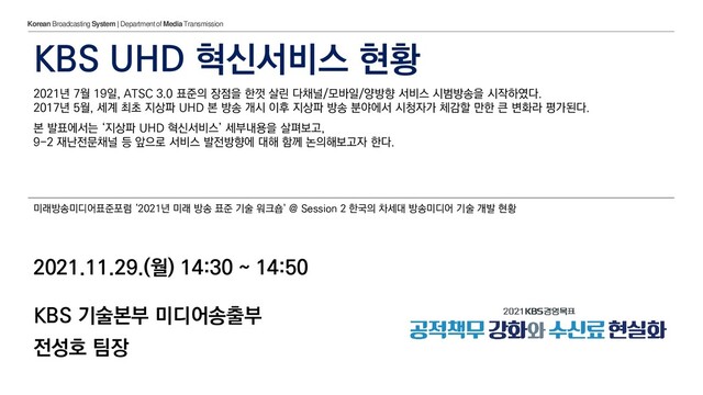 미디어송출부 전성호 팀장 미래방송미디어표준포럼 ‘2021년 미래 방송 표준 기술 워크숍’ @ Session 2 한국의 차세대 방송미디어 기술 개발 현황 Korean BroadcastingSystem | Department of MediaTransmission 2021년 7월 19일, ATSC 3.0 표준의 장점을 한껏 살린 다채널/모바일/양방향 서비스 시범방송을 시작하였다. 2017년 5월, 세계 최초 지상파 UHD 본 방송 개시 이후 지상파 방송 분야에서 시청자가 체감할 만한 큰 변화라 평가된다. 본 발표에서는 ‘지상파 UHD 혁신서비스’ 세부내용을 살펴보고, 9-2 재난전문채널 등 앞으로 서비스 발전방향에 대해 함께 논의해보고자 한다.