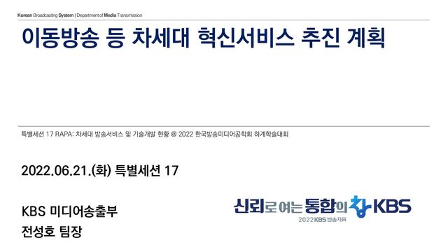 2019 2020 2021 2022 2023 2024 2025 2026 2027 [국책] Release 16 기반 5G 연동 [국책] 8K 전송 ATSC 1.0 DTV방송 종료 2019.11. 5kW 대출력 UHD+4HD+3R 동시전송 성공 2021.04. 이중편파(수직/수평) ATSC 3.0 MIMO 발사 2021.07. ATSC 3.0 다채널/모바일/양방향 혁신서비스 개시 스마트폰 차량내장 가정댁내 2021.11. 국내 최초 5G Broadcast 전파 발사 기념식 2022.02. ATSC 3.0 내장 스마트폰 시연회 2021.08. 차량내장형 수신기 수도권 성능 평가 CH56+CH52 채널결합(Bonding) 전파 발사 CH56+CH52 채널결합(Bonding) + 이중편파 MIMO 전파 발사 100Mbps /6MHz 100Mbps /6+6MHz 200Mbps /6+6MHz 2022.11. 글로벌 제조사 공동 스마트폰 대상 직접수신 성능평가 [국책] Release 18 기반 국민들이 체감할 수 있도록 ‘지상파 직접수신 플랫폼’ 경쟁력을 높이는 것, 그 자체가 수신료의 튼튼한 기반입니다. 이미 KBS는 준비하고 있습니다.