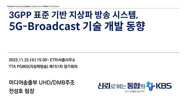 5G TECHNOLOGY - CONVERGENCE WITH BROADCAST https://www.ibc.org/technical-papers/ibc2023-technical-paper-sessions-5g-technology-convergence-with-broadcast/10099.article ✓ RAI(Italy) Efficient delivery of audiovisual content to mobile devices combining 5G Broadcast and CDN technologies ✓ Qualcomm 5G Broadcast Receivers: Optimizing Performance under Implementation Constraints ✓ BBC/Dolby/Qualcomm DVB-I service delivery over 5G Systems [FOBTV @ IBC 2023] 기관별 동향 업데이트 발표 [SMPTE Motion Imaging Journal] 게재논문 [IEEE Transactions on Broadcasting & IEEE BMSB 학회] 게재논문 ✓ Dr. Jordi J. Giménez (Head of Technology 5G-MAG), 5G-MAG: Fostering media connectivity ecosystems ✓ Yin Xu (NERC-DTV 중국상해교통대), 5G Broadcast Technologies & Standards Analysis and Future Outlook ✓ Dr. Thomas Stockhammer (Qualcomm), 5G Broadcast Technologies, Standards and Productization ✓ ETRI/KBS/One Media/Sinclair, Performance Evaluation of 5G MBS for Terrestrial Broadcasting Scenarios ✓ Christophe Burdinat, Thomas Stockhammer, Romain Bouqueau, and Mickaël Raulet, “ATSC 3.0, DVB-I, and TV 3.0 Services via 5G Broadcast—System Design and Reference Tools,” 10.5594/JMI.2023.3236015, March 2023 ✓ Andrea Bertella, Assunta De Vita, Alessandro Lucco Castello, Vittoria Mignone, and Giovanni Vitale “5G-Broadcast: Laboratory Tests and Field Trials for the Mobile TV of Tomorrow,” 10.5594/JMI.2023.3286874, July 2023 [ITU-R SG6/WP6A] 작업문서 [3GPP Documents] ✓ Dongwook Kim(3GPP MCC) https://www.3gpp.org/technologies/broadcast-multicast1 ✓ ETSI TS 103 720 V1.2.1 (2023-06) 5G Broadcast System for linear TV and radio services; LTE-based 5G terrestrial broadcast system