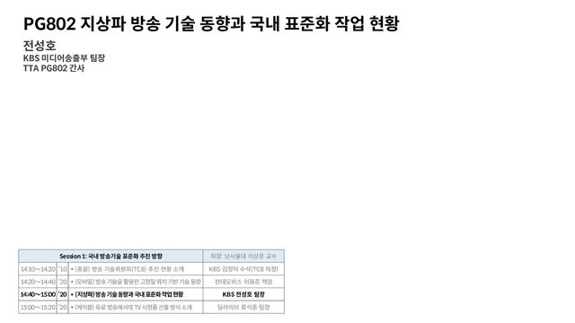 교수 14:10~14:20 ’10 (총괄) 방송 기술위원회(TC8) 추진 현황 소개 KBS 김정덕 수석(TC8 의장) 14:20~14:40 ’20 (모바일) 방송 기술을 활용한 고정밀 위치 기반 기술 동향 현대모비스 이용준 책임 14:40~15:00 ’20 (지상파)방송 기술 동향과 국내 표준화 작업 현황 KBS 전성호 팀장 15:00~15:20 ’20 (케이블) 유료 방송에서의 TV시청률 산출 방식 소개 딜라이브 류석종 팀장 PG802 지상파 방송 기술 동향과 국내 표준화 작업 현황 전성호 KBS 미디어송출부 팀장 TTA PG802 간사