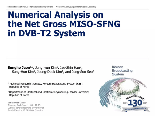 IEEE BMSB 2015 Thursday 26th June 11:00 - 12:25 Cultural centre Het Pand @ Vermeylen Parallel Session 12 MIMO & Diversity