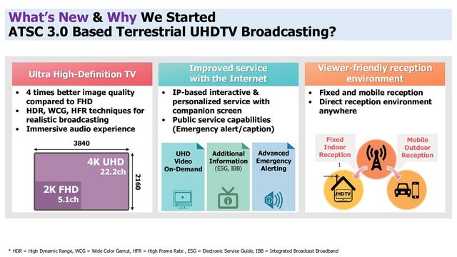 UHDTV Broadcasting? Viewer-friendly reception environment • Fixed and mobile reception • Direct reception environment anywhere Fixed Indoor Reception Mobile Outdoor Reception Improved service with the Internet • IP-based interactive & personalized service with companion screen • Public service capabilities (Emergency alert/caption) Advanced Emergency Alerting UHD Video On-Demand Additional Information (ESG, IBB) Ultra High-Definition TV • 4 times better image quality compared to FHD • HDR, WCG, HFR techniques for realistic broadcasting • Immersive audio experience 2K FHD 5.1ch 4K UHD 22.2ch 3840 2160 UHDTV * HDR = High Dynamic Range, WCG = Wide Color Gamut, HFR = High Frame Rate , ESG = Electronic Service Guide, IBB = Integrated Broadcast Broadband 1