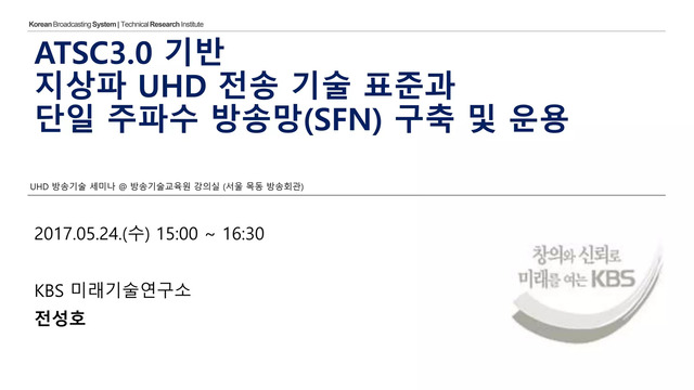 ATSC3.0 기반 지상파 UHD 전송 기술 표준과 단일 주파수 방송망(SFN) 구축 및 운용 / UHD 방송기술 세미나 @ 방송기술교육원 강의실 (서울 목동 방송회관)