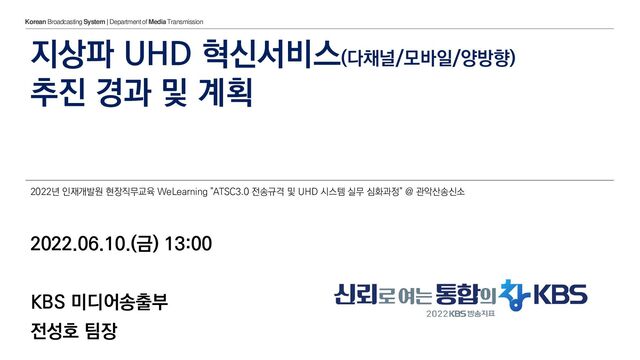 2019 2020 2021 2022 2023 2024 2025 2026 2027 [국책] Release 16 기반 5G 연동 [국책] 8K 전송 ATSC 1.0 DTV방송 종료 2019.11. 5kW 대출력 UHD+4HD+3R 동시전송 성공 2021.04. 이중편파(수직/수평) ATSC 3.0 MIMO 발사 2021.07. ATSC 3.0 다채널/모바일/양방향 혁신서비스 개시 스마트폰 차량내장 가정댁내 2021.11. 국내 최초 5G Broadcast 전파 발사 기념식 2022.02. ATSC 3.0 내장 스마트폰 시연회 2021.08. 차량내장형 수신기 수도권 성능 평가 CH56+CH52 채널결합(Bonding) 전파 발사 CH56+CH52 채널결합(Bonding) + 이중편파 MIMO 전파 발사 100Mbps /6MHz 100Mbps /6+6MHz 200Mbps /6+6MHz 2022.11. 글로벌 제조사 공동 스마트폰 대상 직접수신 성능평가 [국책] Release 18 기반 국민들이 체감할 수 있도록 ‘지상파 직접수신 플랫폼’ 경쟁력을 높이는 것, 그 자체가 수신료의 튼튼한 기반입니다. 이미 KBS는 준비하고 있습니다.