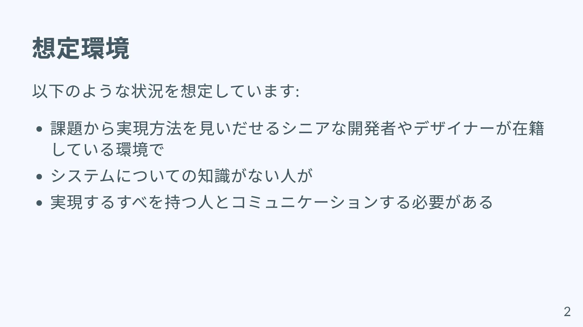 想定環境 以下のような状況を想定しています: 課題から実現方法を見いだせるシニアな開発者やデザイナーが在籍 している環境で システムについての知識がない人が 実現するすべを持つ人とコミュニケーションする必要がある 2