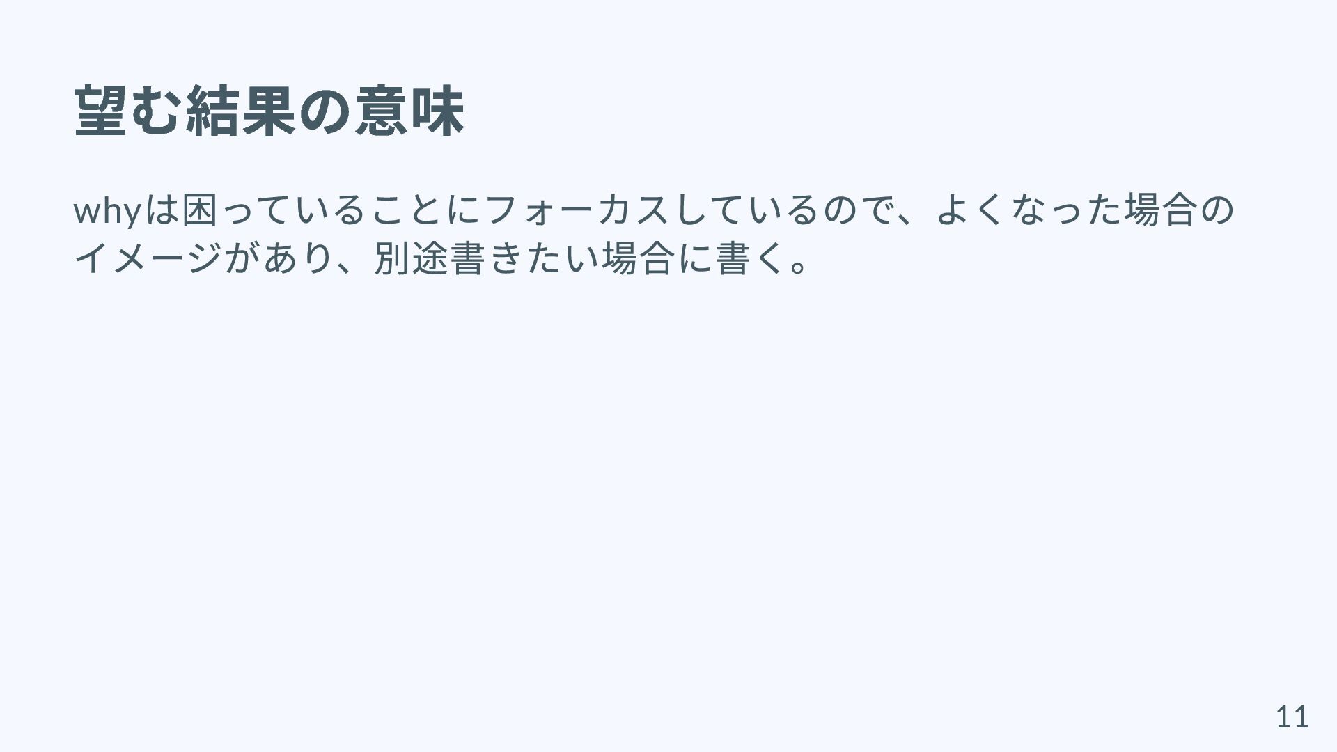 望む結果の意味 why は困っていることにフォーカスしているので、よくなった場合の イメージがあり、別途書きたい場合に書く。 11
