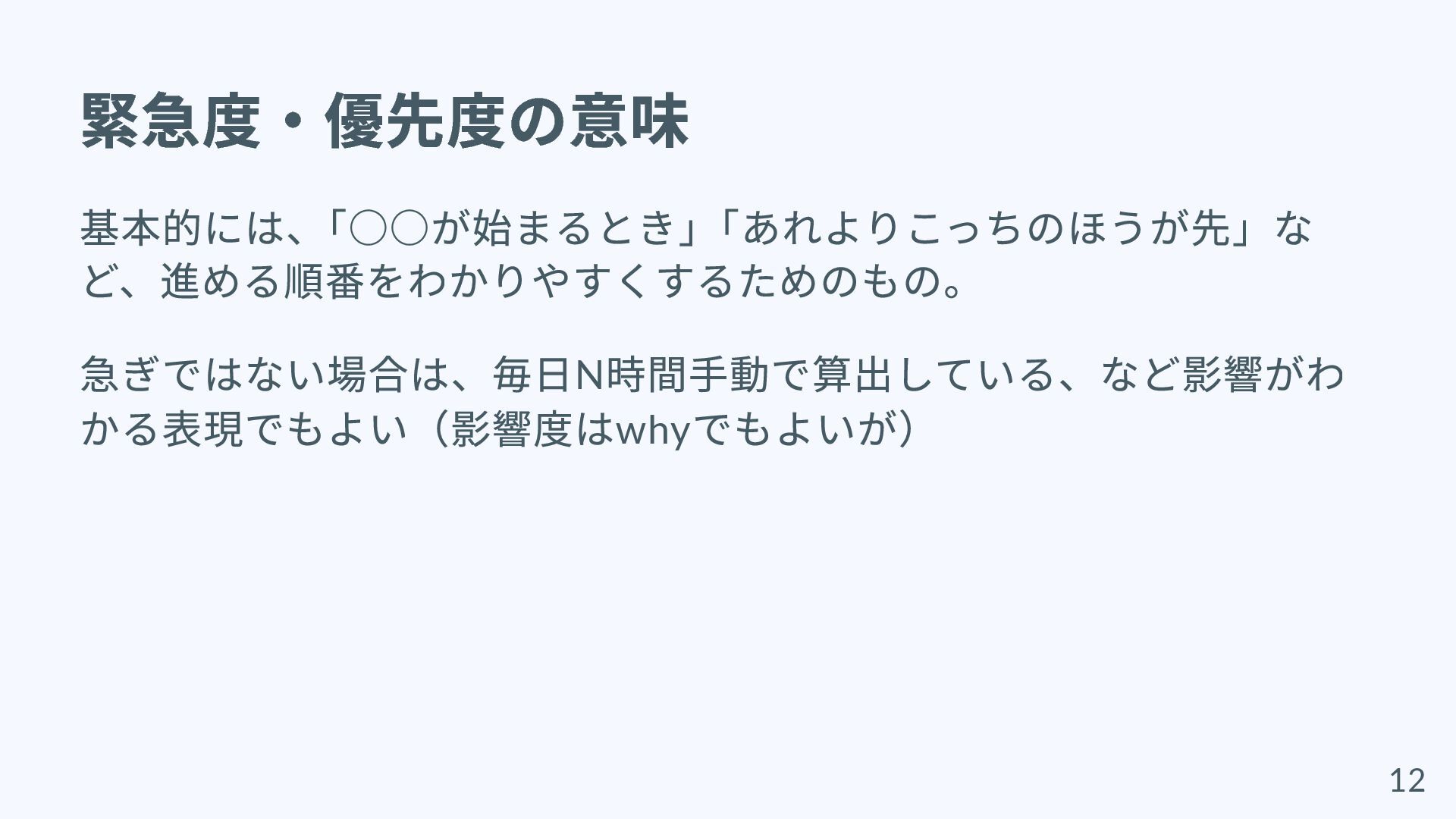 緊急度・優先度の意味 基本的には、 「◦◦が始まるとき」 「あれよりこっちのほうが先」な ど、進める順番をわかりやすくするためのもの。 急ぎではない場合は、毎日N 時間手動で算出している、など影響がわ かる表現でもよい(影響度はwhy でもよいが) 12