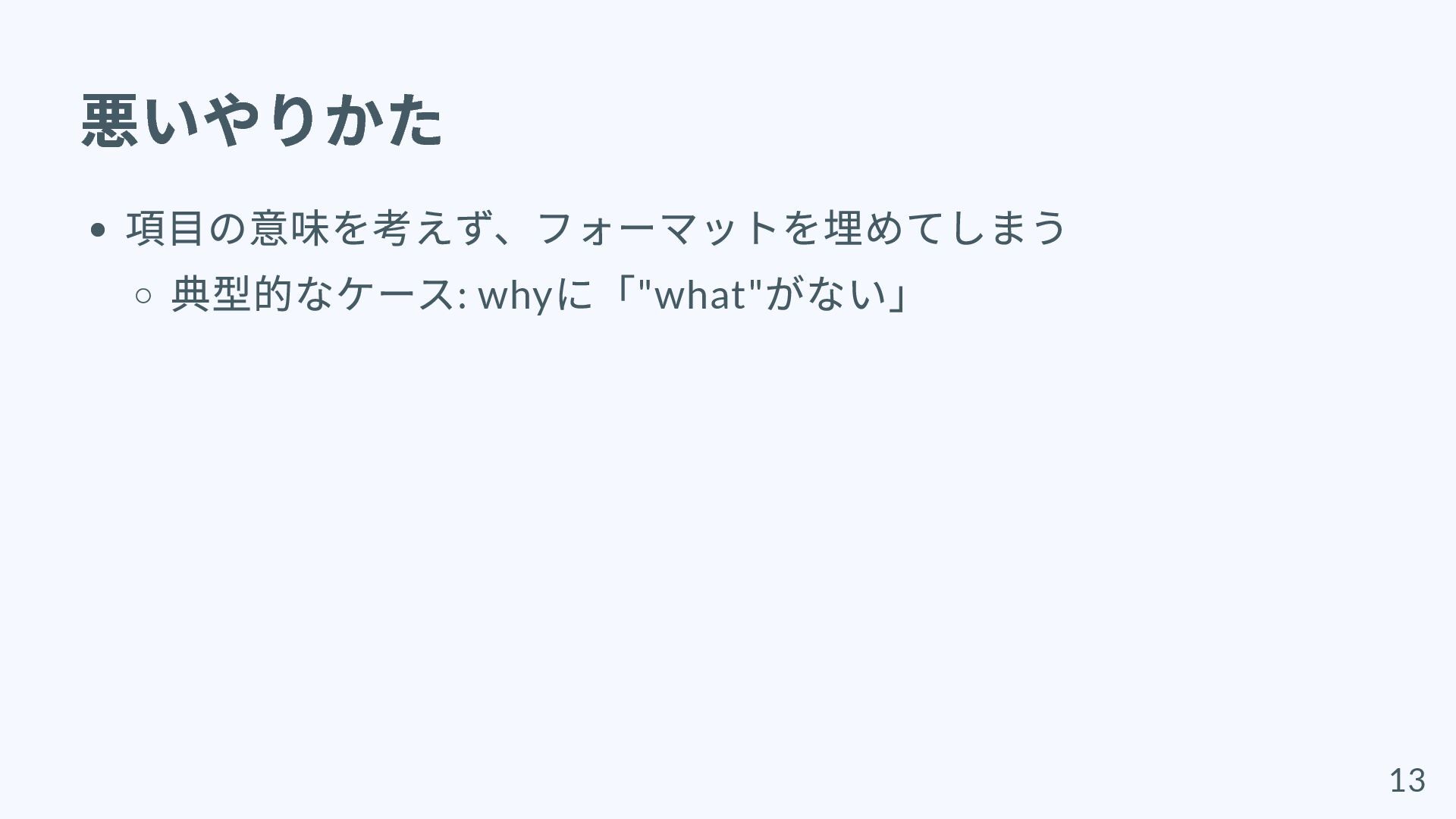 悪いやりかた 項目の意味を考えず、フォーマットを埋めてしまう 典型的なケース: why に「"what" がない」 13