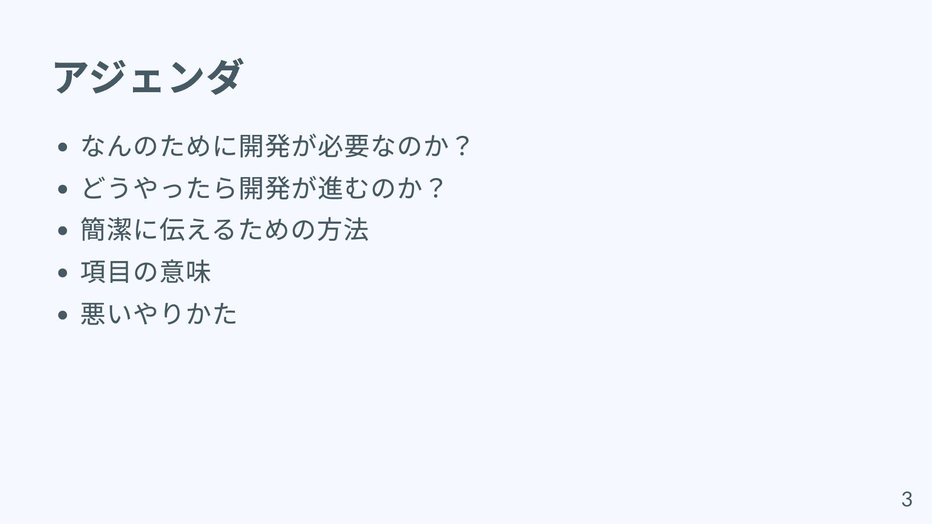 アジェンダ なんのために開発が必要なのか? どうやったら開発が進むのか? 簡潔に伝えるための方法 項目の意味 悪いやりかた 3