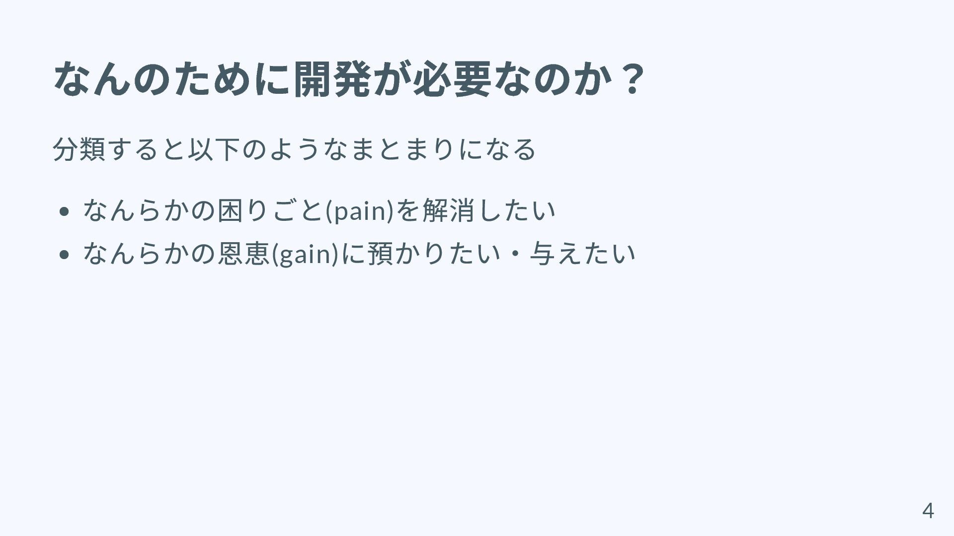 なんのために開発が必要なのか? 分類すると以下のようなまとまりになる なんらかの困りごと(pain) を解消したい なんらかの恩恵(gain) に預かりたい・与えたい 4