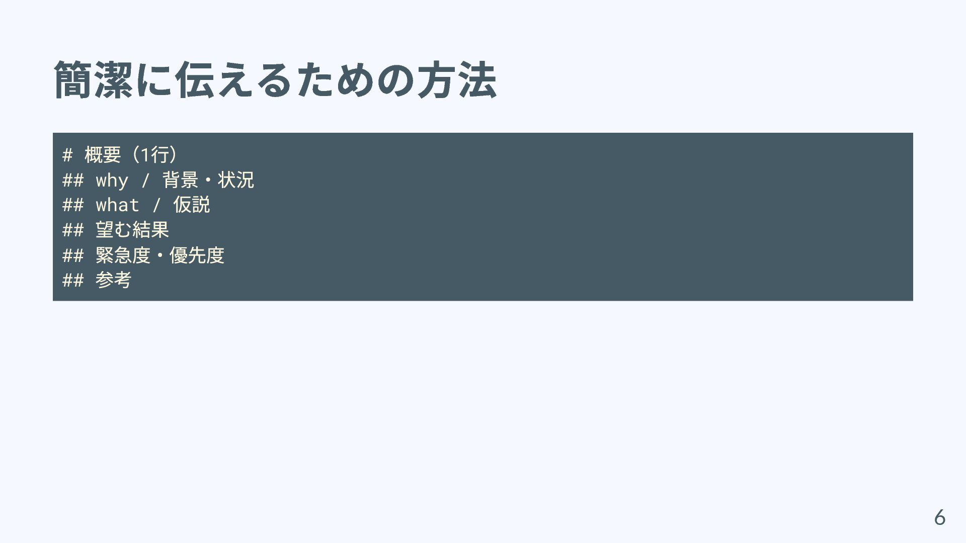 簡潔に伝えるための方法 # 概要(1 行) ## why / 背景・状況 ## what