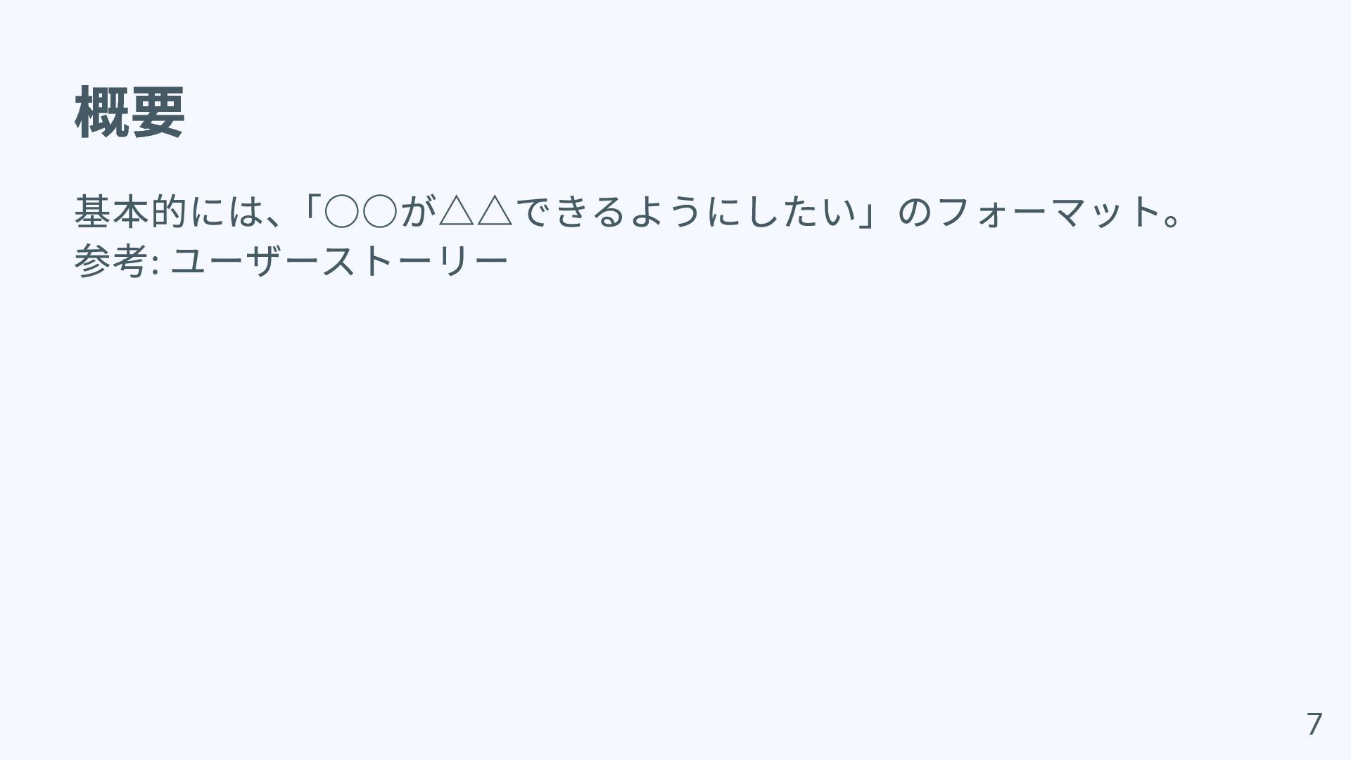 概要 基本的には、 「◦◦が△△できるようにしたい」のフォーマット。 参考: ユーザーストーリー 7