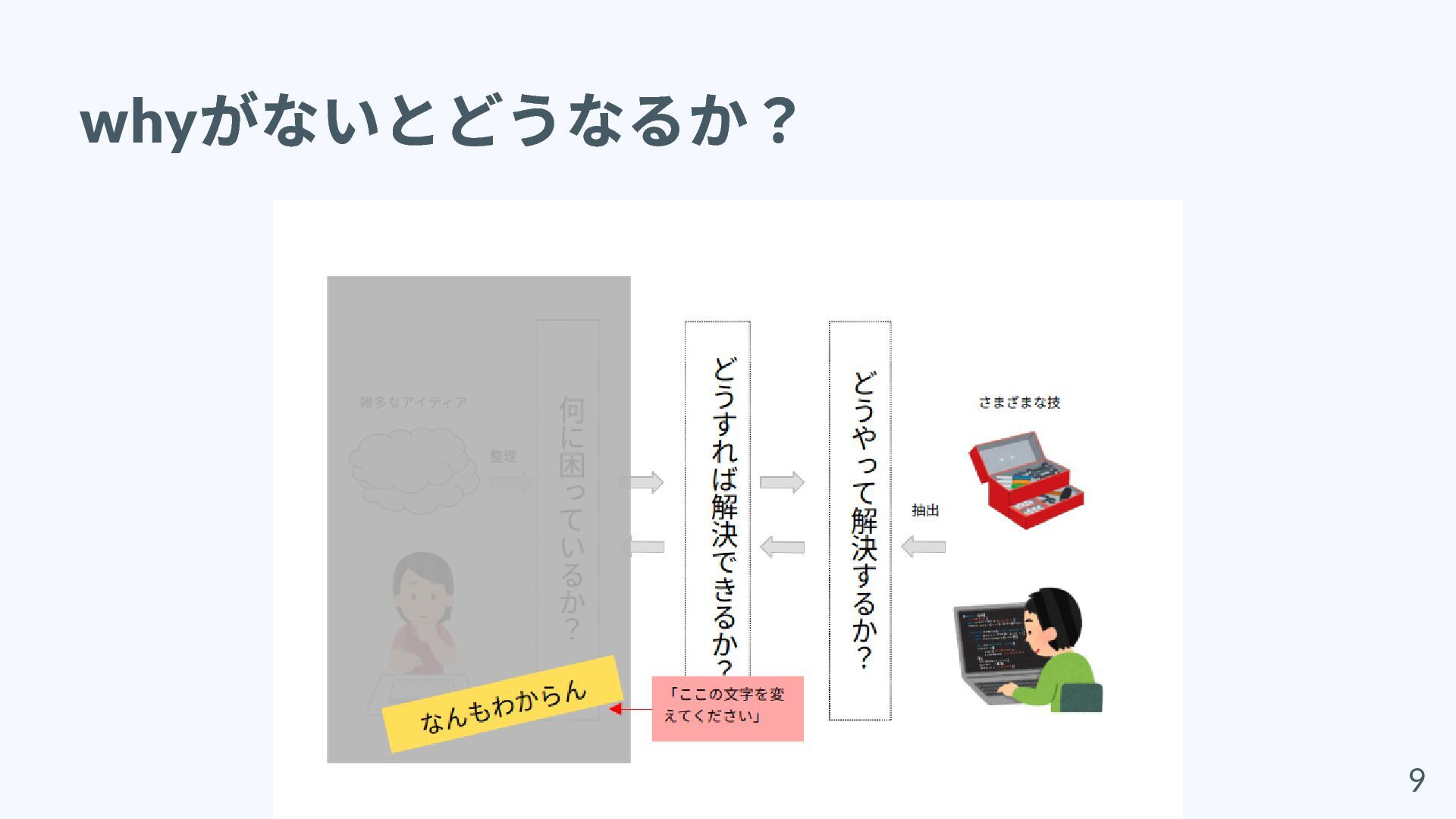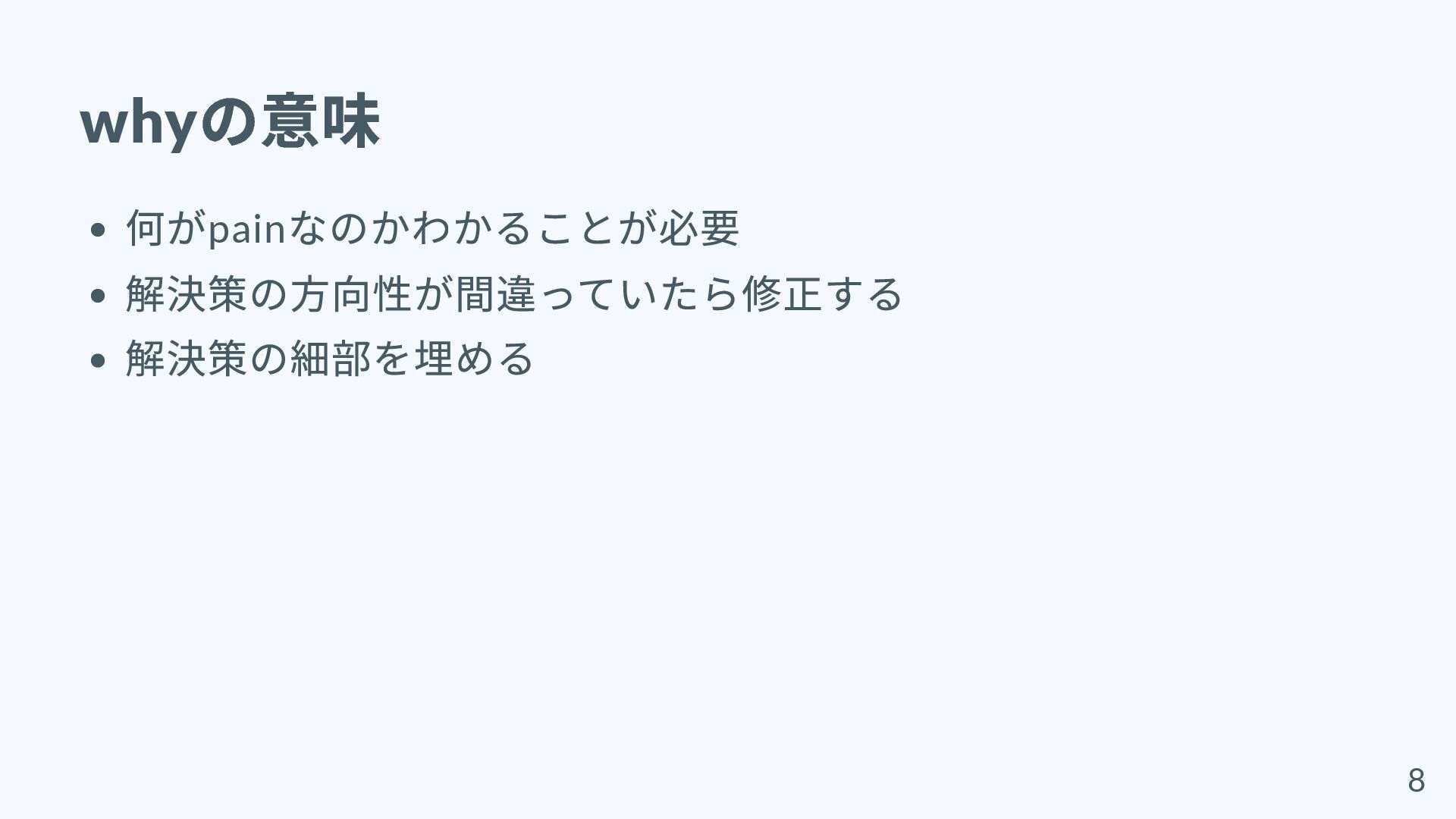 why の意味 何がpain なのかわかることが必要 解決策の方向性が間違っていたら修正する 解決策の細部を埋める 8