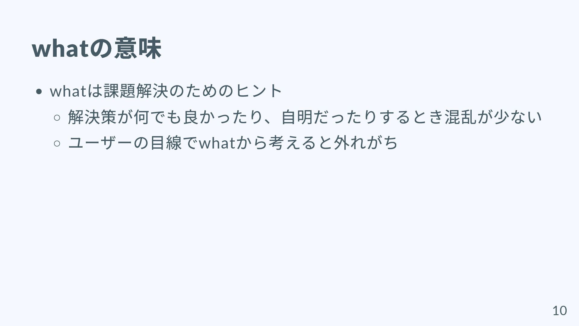 what の意味 what は課題解決のためのヒント 解決策が何でも良かったり、自明だったりするとき混乱が少ない ユーザーの目線でwhat から考えると外れがち 10