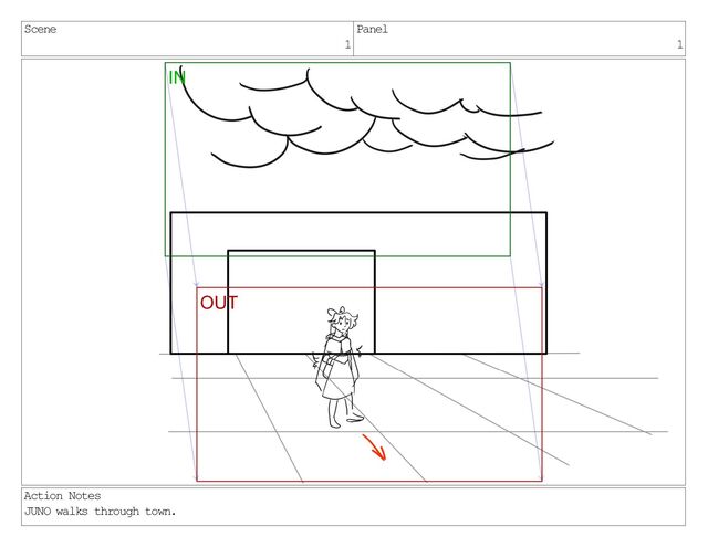 Scene 1 Panel 1 Action Notes JUNO walks through town.