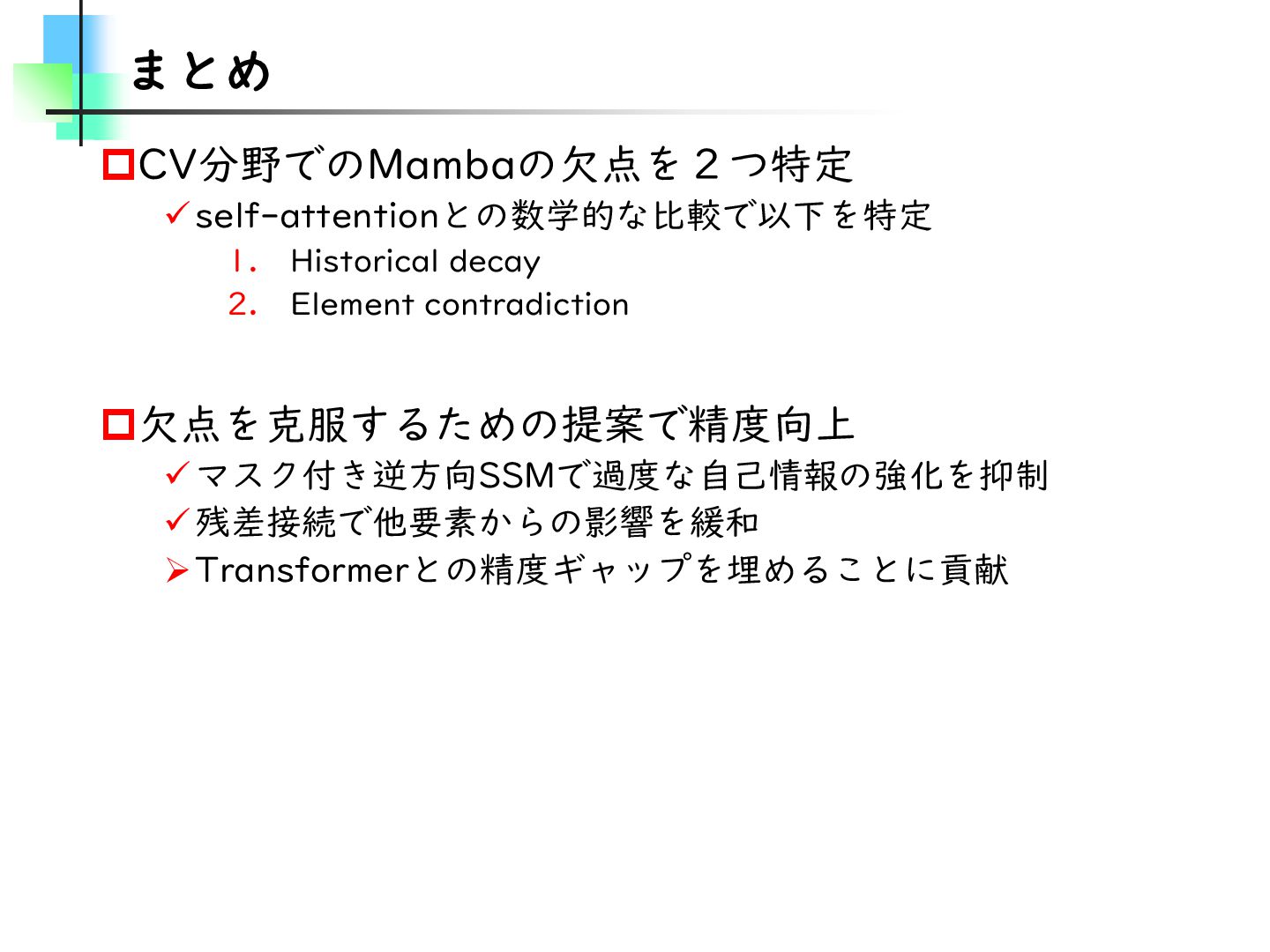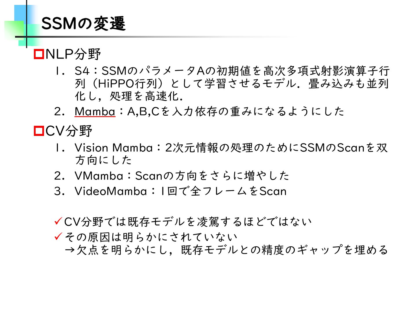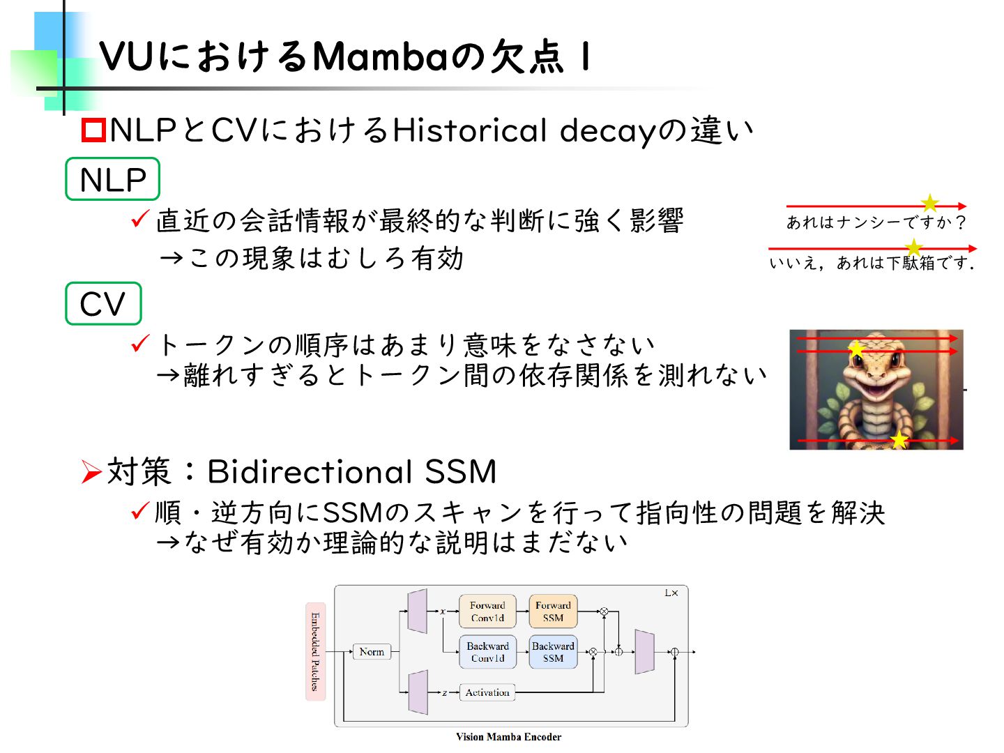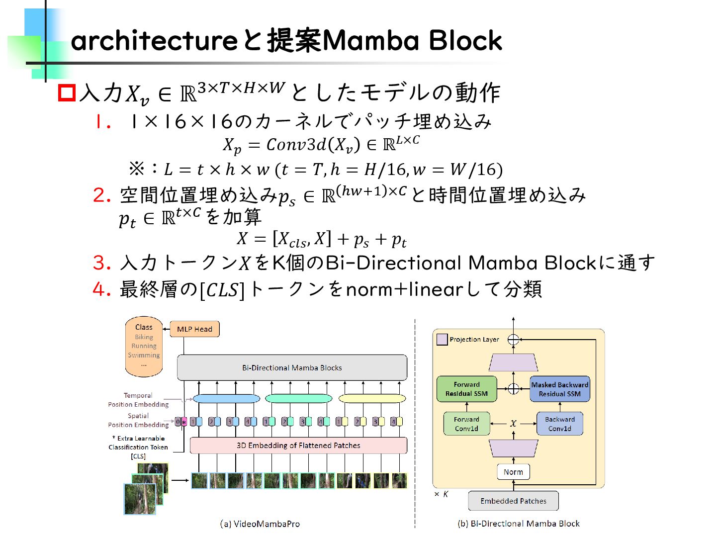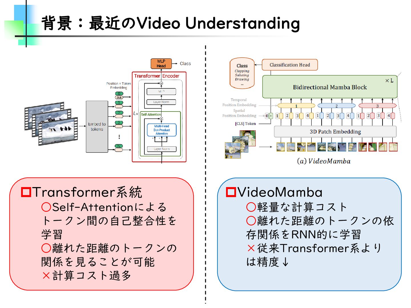 この論文はVideoMamba【ECCV2024】を改良し、MambaとTransformerモデルのギャップを埋めることを目的とした論文です。そのために、TransformerとMambaを数学的な観点から分析し、CV分野におけるMamba特有の問題を発見・改善しています。結果としては、SSMが得意とする計算量やパラメータの優位性を保ちながらTransformerモデルの精度に近づけることに成功しています。