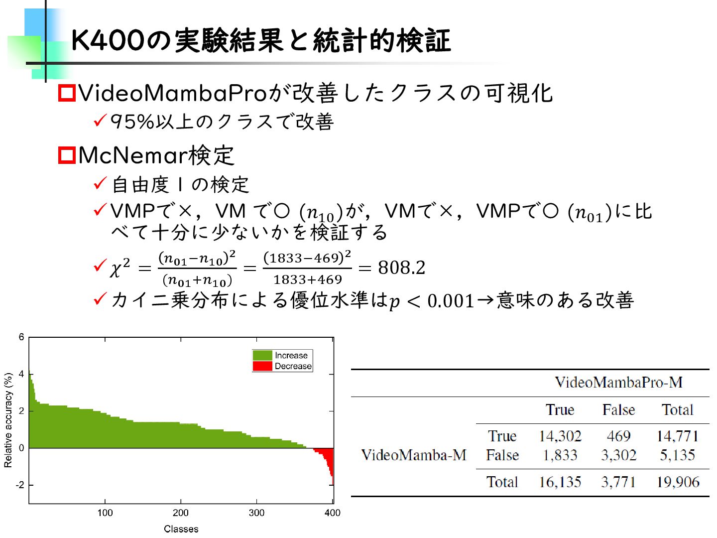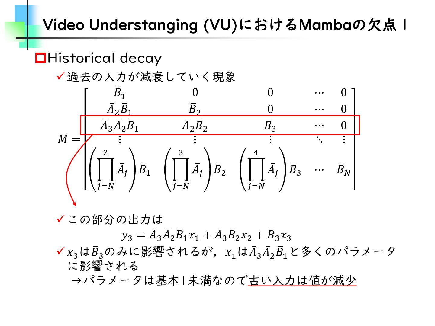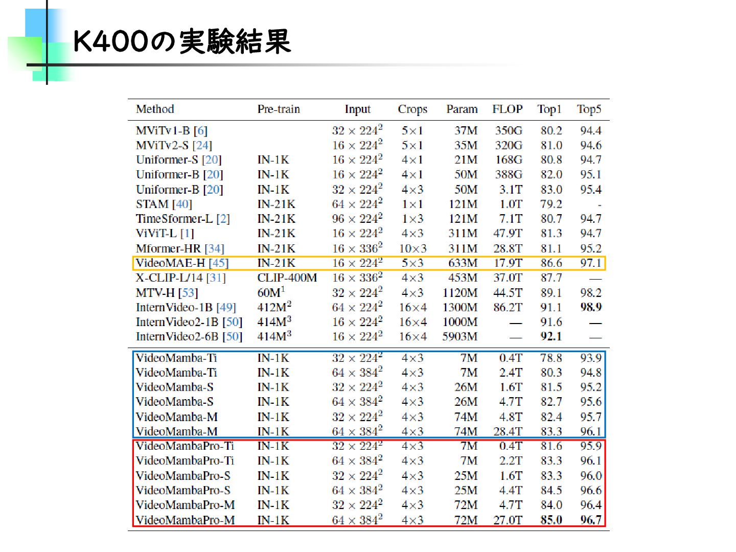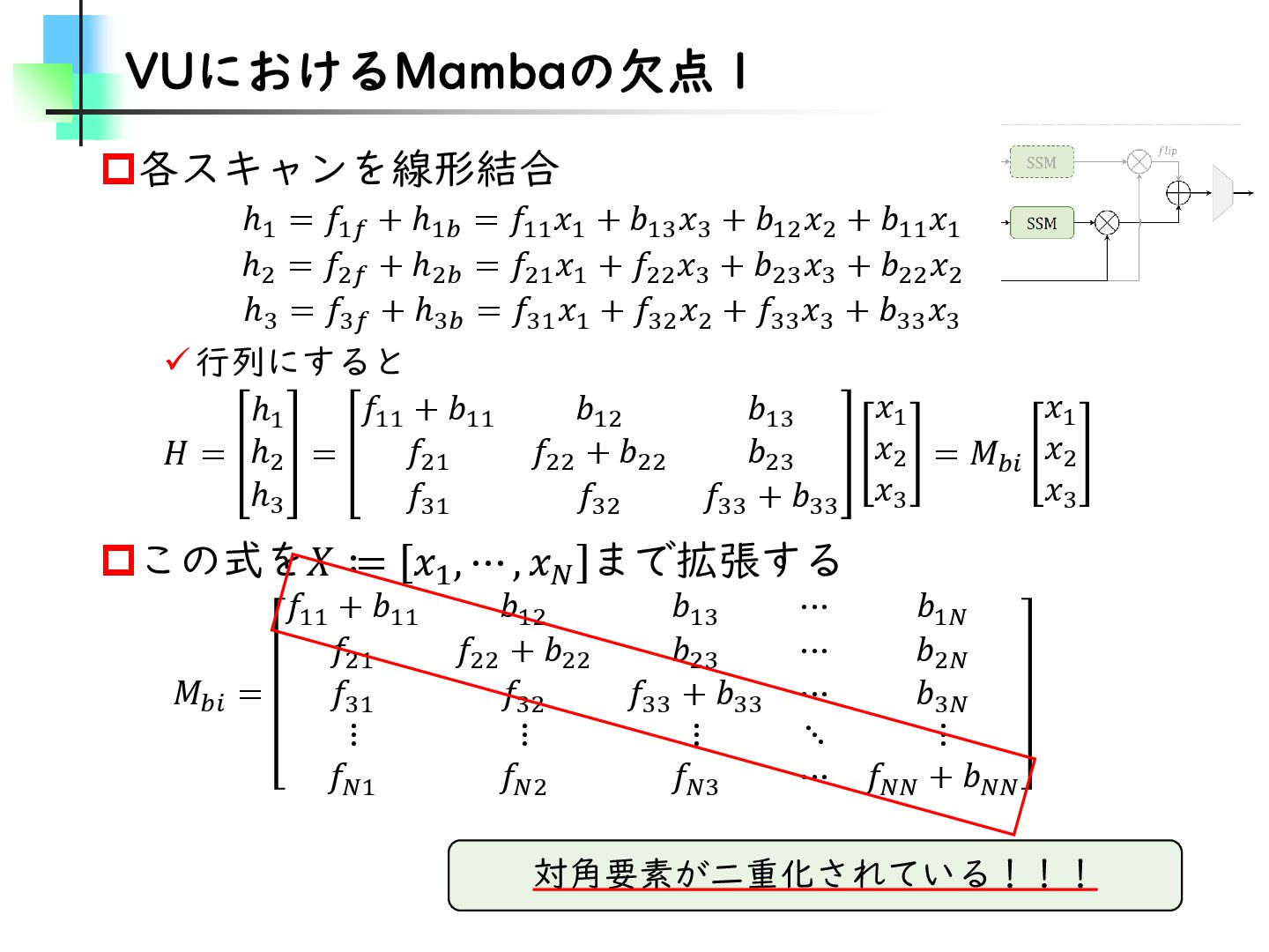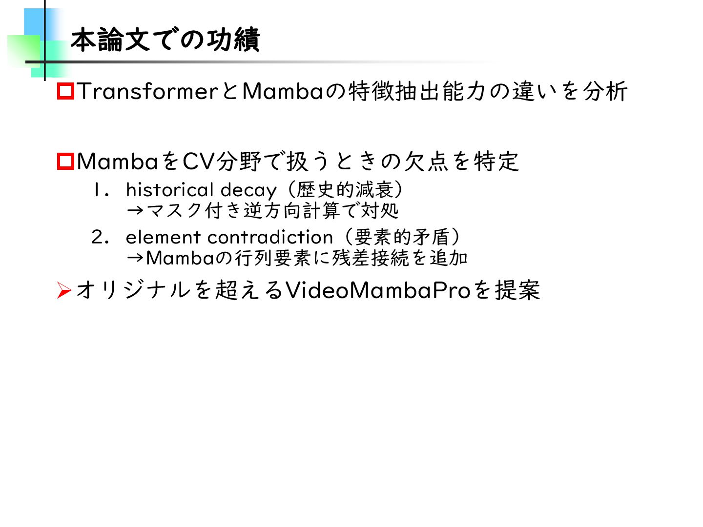 この論文はVideoMamba【ECCV2024】を改良し、MambaとTransformerモデルのギャップを埋めることを目的とした論文です。そのために、TransformerとMambaを数学的な観点から分析し、CV分野におけるMamba特有の問題を発見・改善しています。結果としては、SSMが得意とする計算量やパラメータの優位性を保ちながらTransformerモデルの精度に近づけることに成功しています。