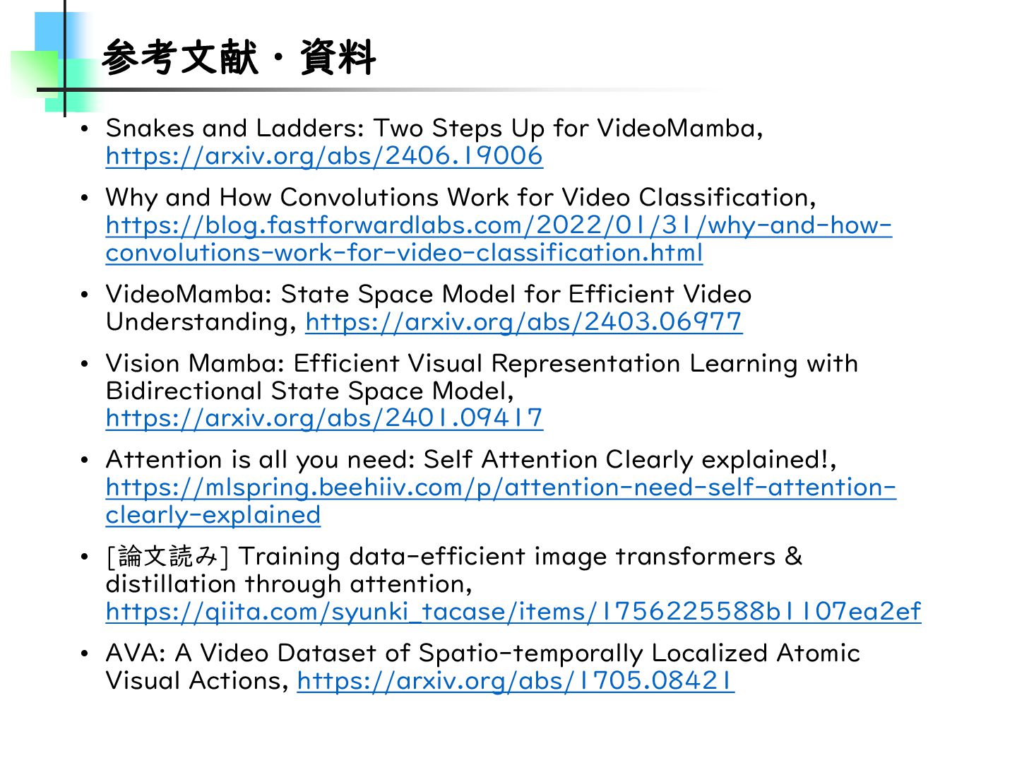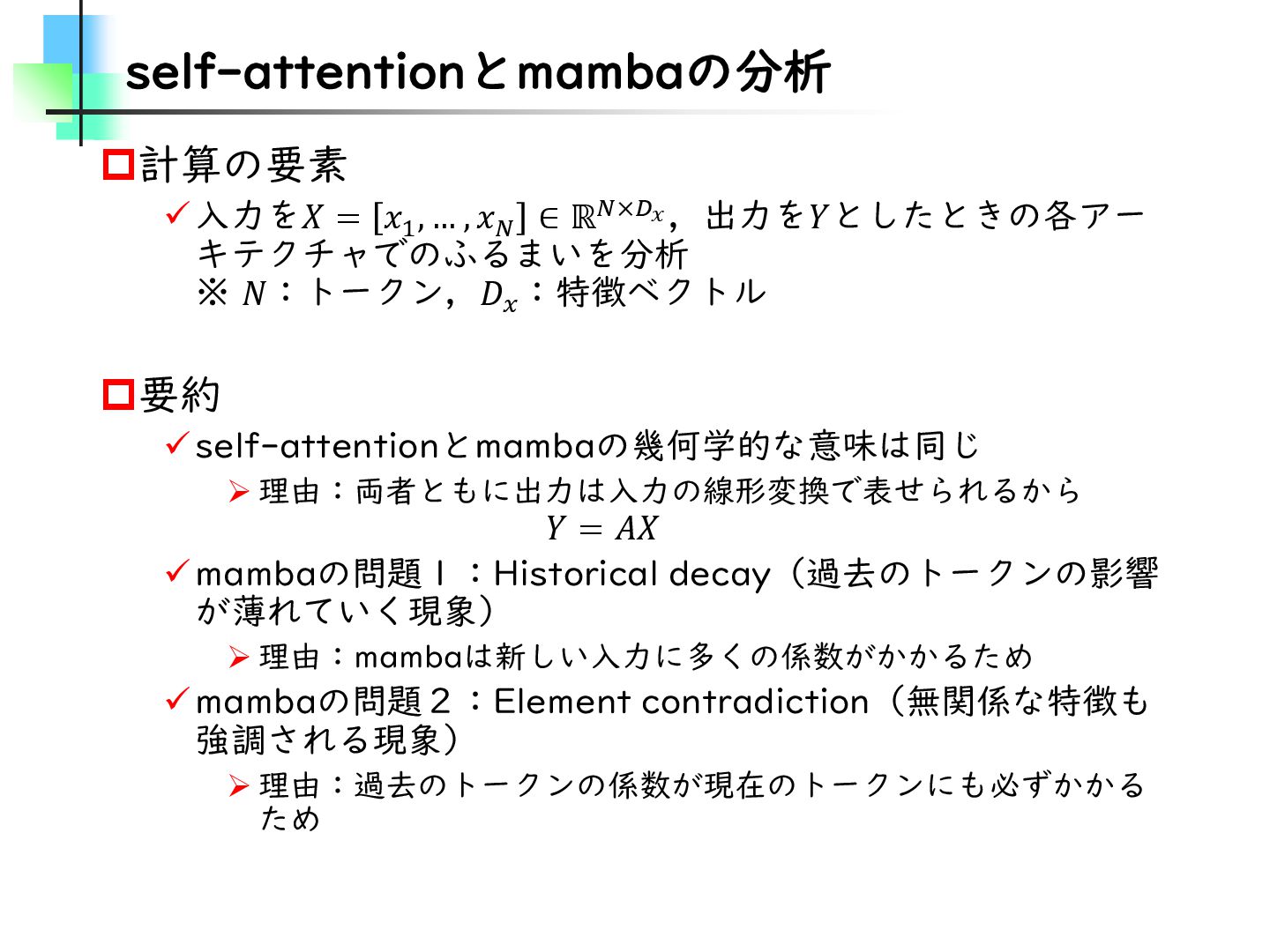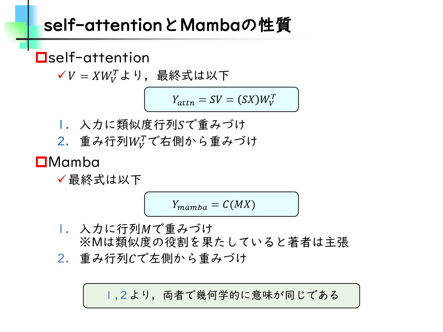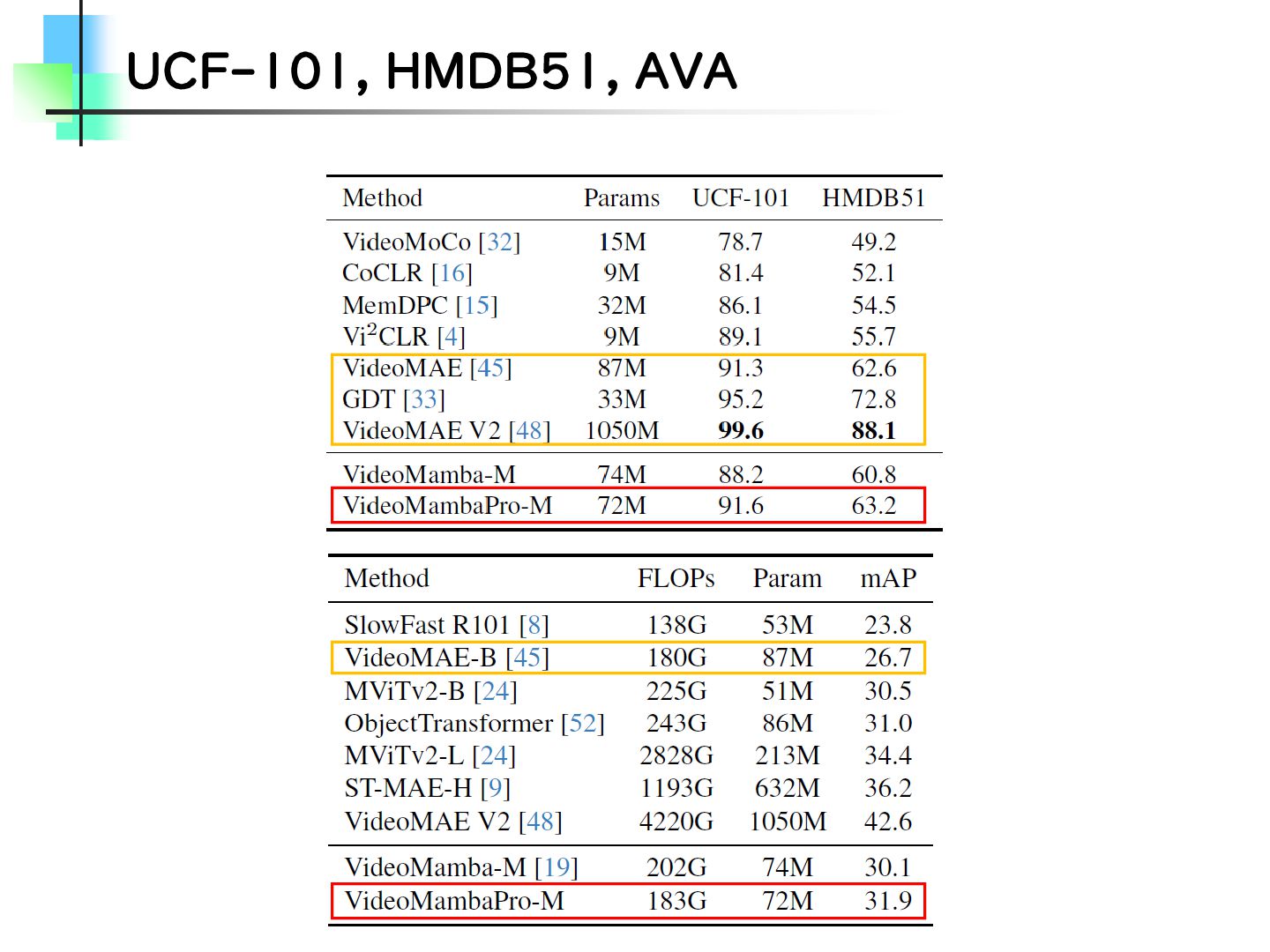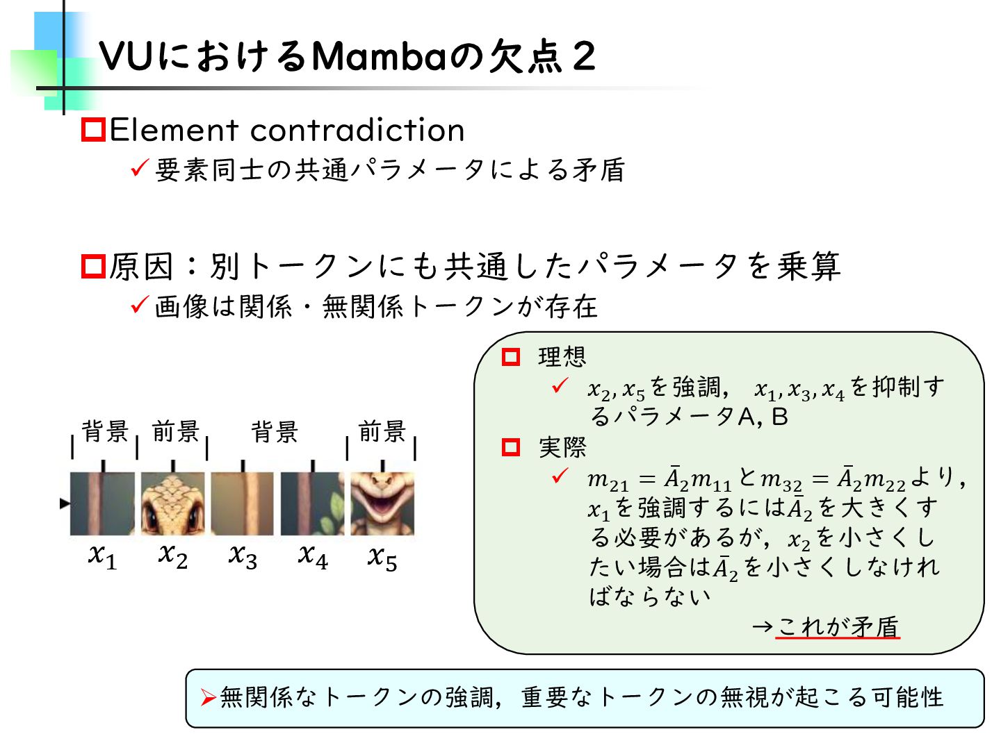 この論文はVideoMamba【ECCV2024】を改良し、MambaとTransformerモデルのギャップを埋めることを目的とした論文です。そのために、TransformerとMambaを数学的な観点から分析し、CV分野におけるMamba特有の問題を発見・改善しています。結果としては、SSMが得意とする計算量やパラメータの優位性を保ちながらTransformerモデルの精度に近づけることに成功しています。