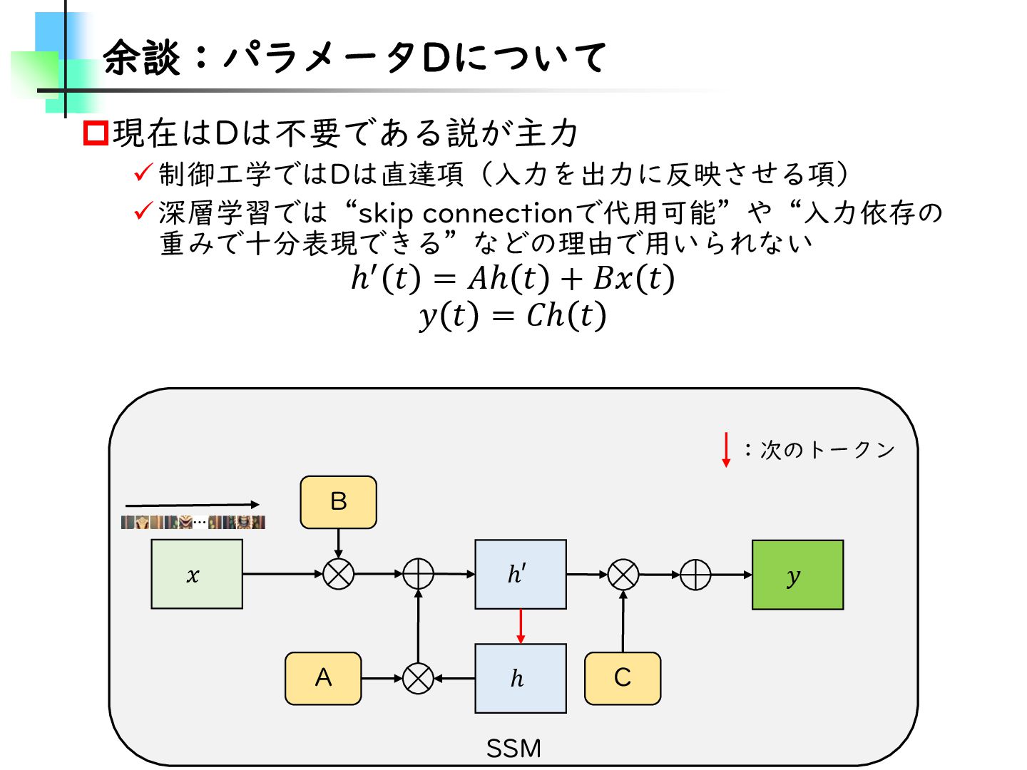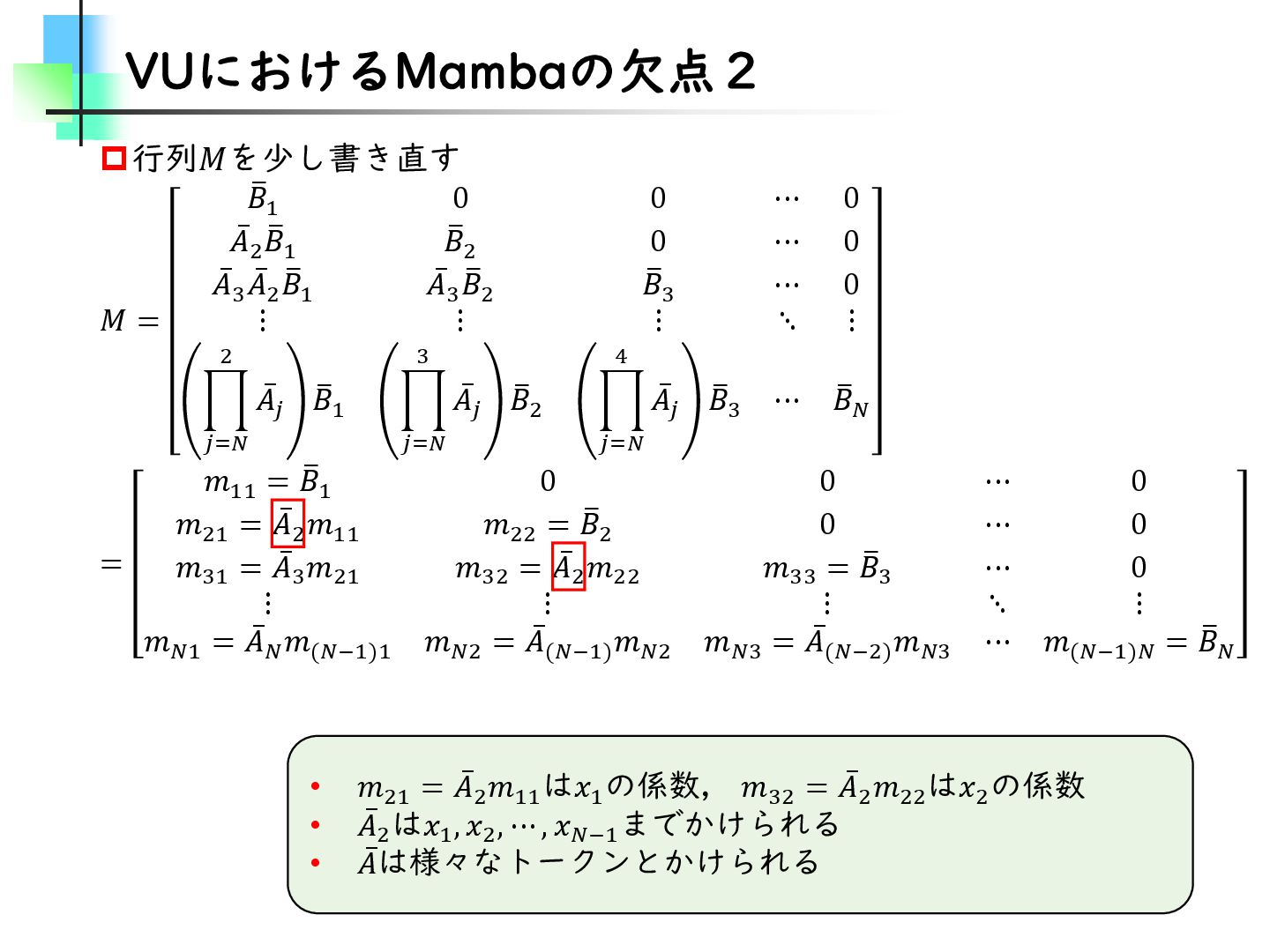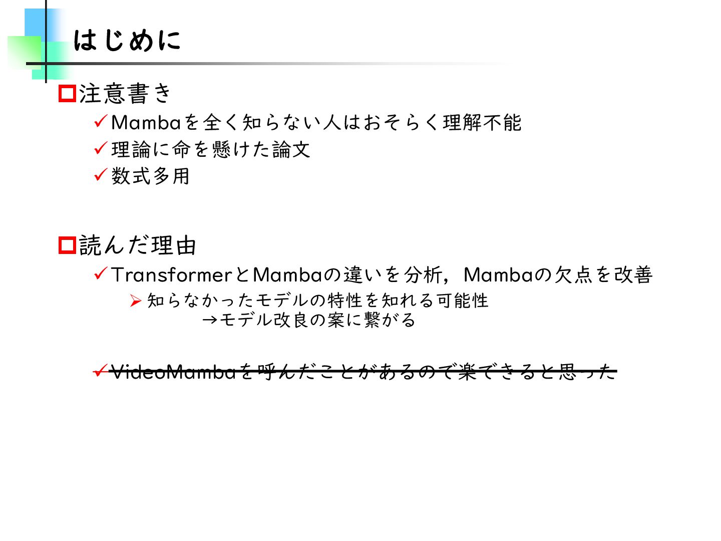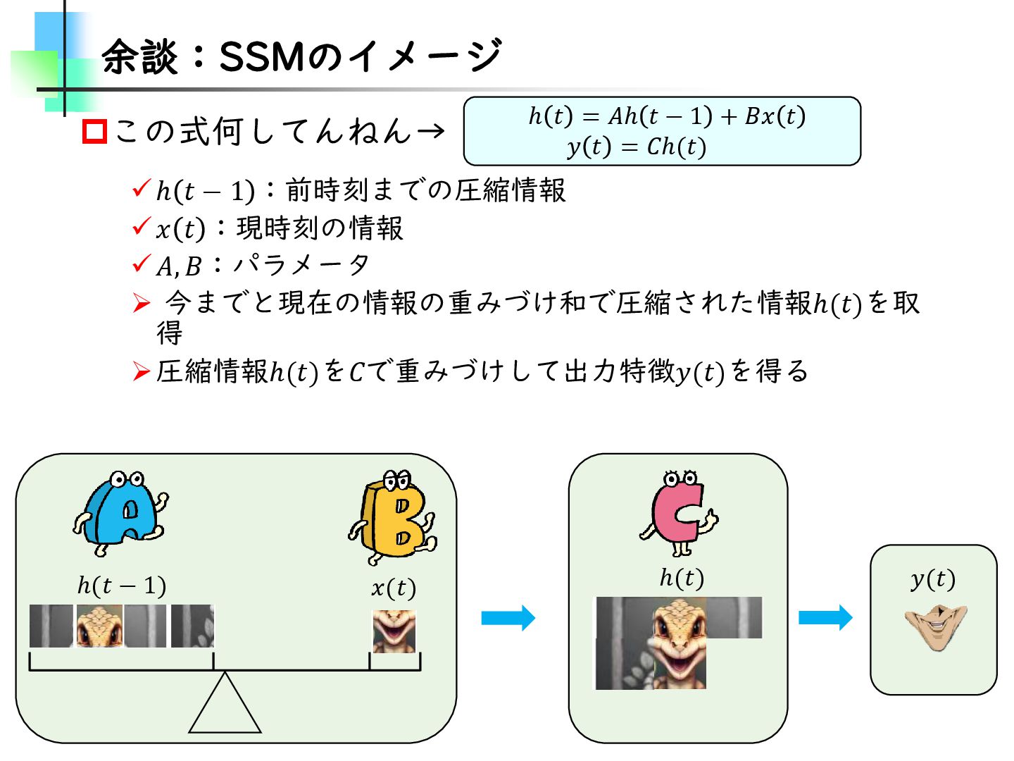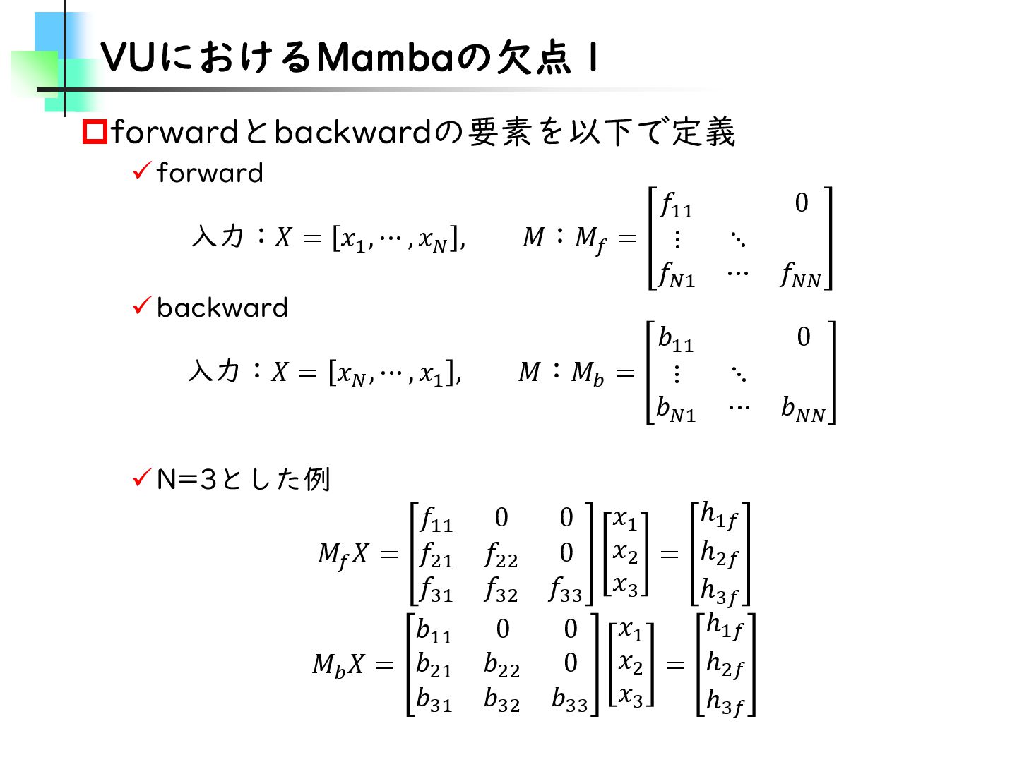 この論文はVideoMamba【ECCV2024】を改良し、MambaとTransformerモデルのギャップを埋めることを目的とした論文です。そのために、TransformerとMambaを数学的な観点から分析し、CV分野におけるMamba特有の問題を発見・改善しています。結果としては、SSMが得意とする計算量やパラメータの優位性を保ちながらTransformerモデルの精度に近づけることに成功しています。