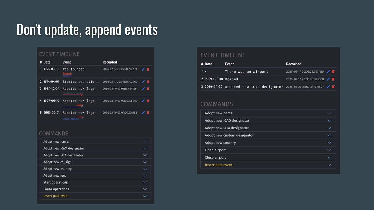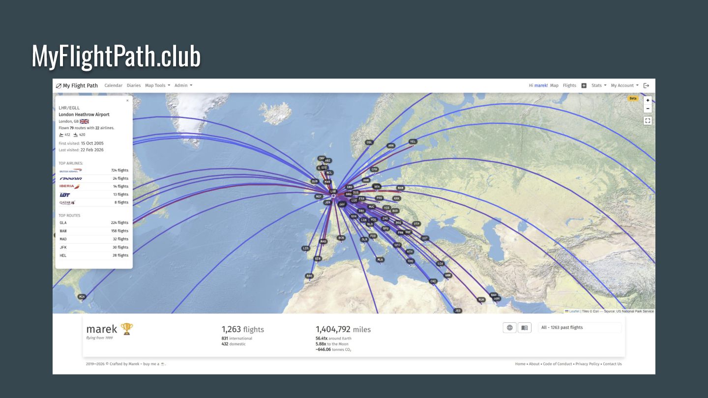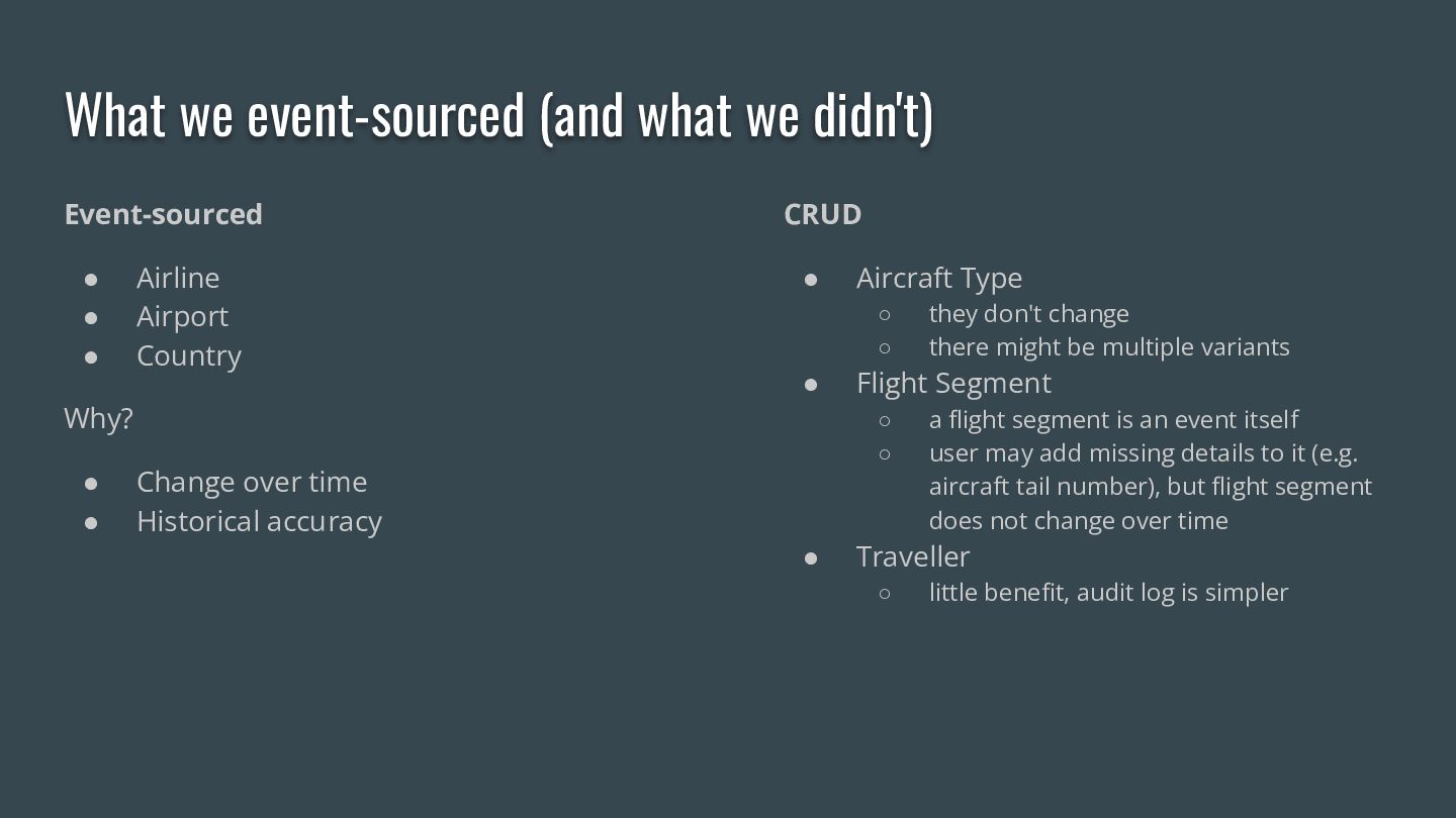 This talk is the story of how a hobby flight logger app outgrew its database, what event sourcing looks like in practice, and what you can take back to your projects. We'll walk through the core ideas — append-only event logs, projections, temporal queries — using real examples from aviation data where airlines merge, airports get renamed, and borders shift across decades.