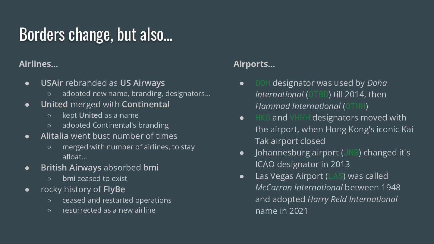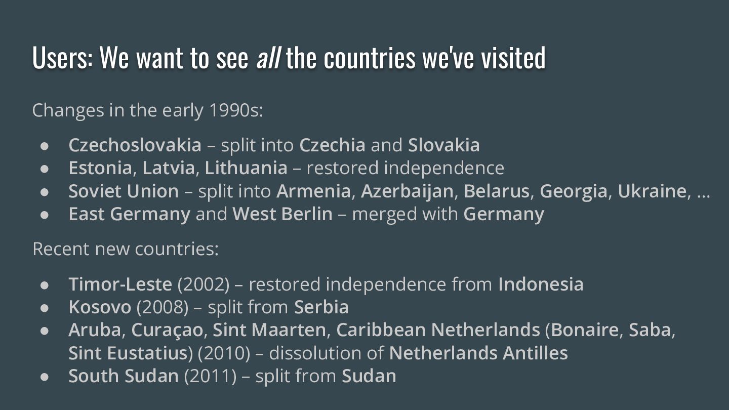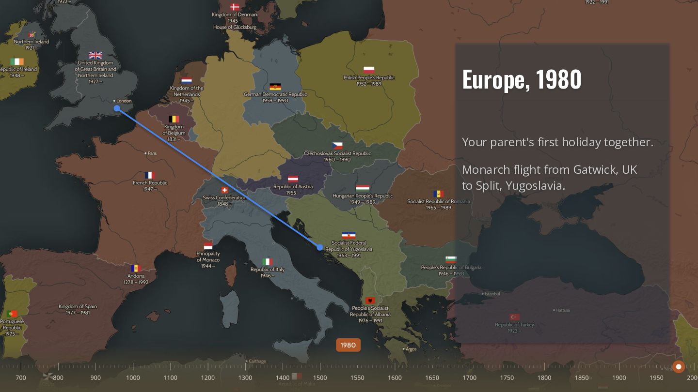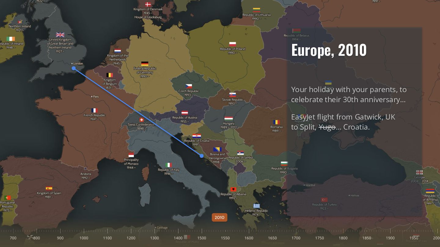 Your parents flew to Split for their summer holiday. They visited Yugoslavia. But Yugoslavia doesn't exist any more — so why does your flight tracker say they went to Croatia?