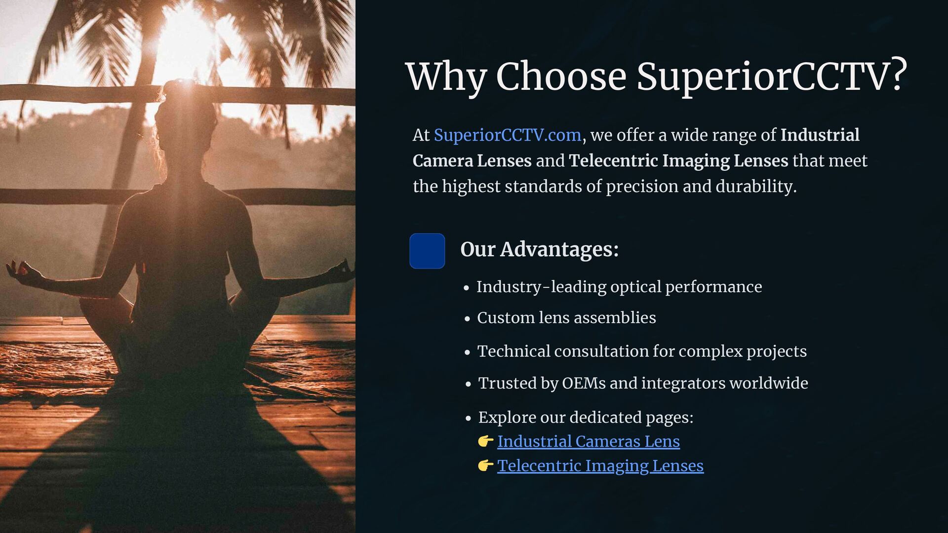 Discover high-precision solutions with our expert guide on Industrial Cameras Lens and Telecentric Imaging Lens. Learn how to achieve distortion-free imaging and boost accuracy in machine vision and inspection systems with SuperiorCCTV’s advanced optics.