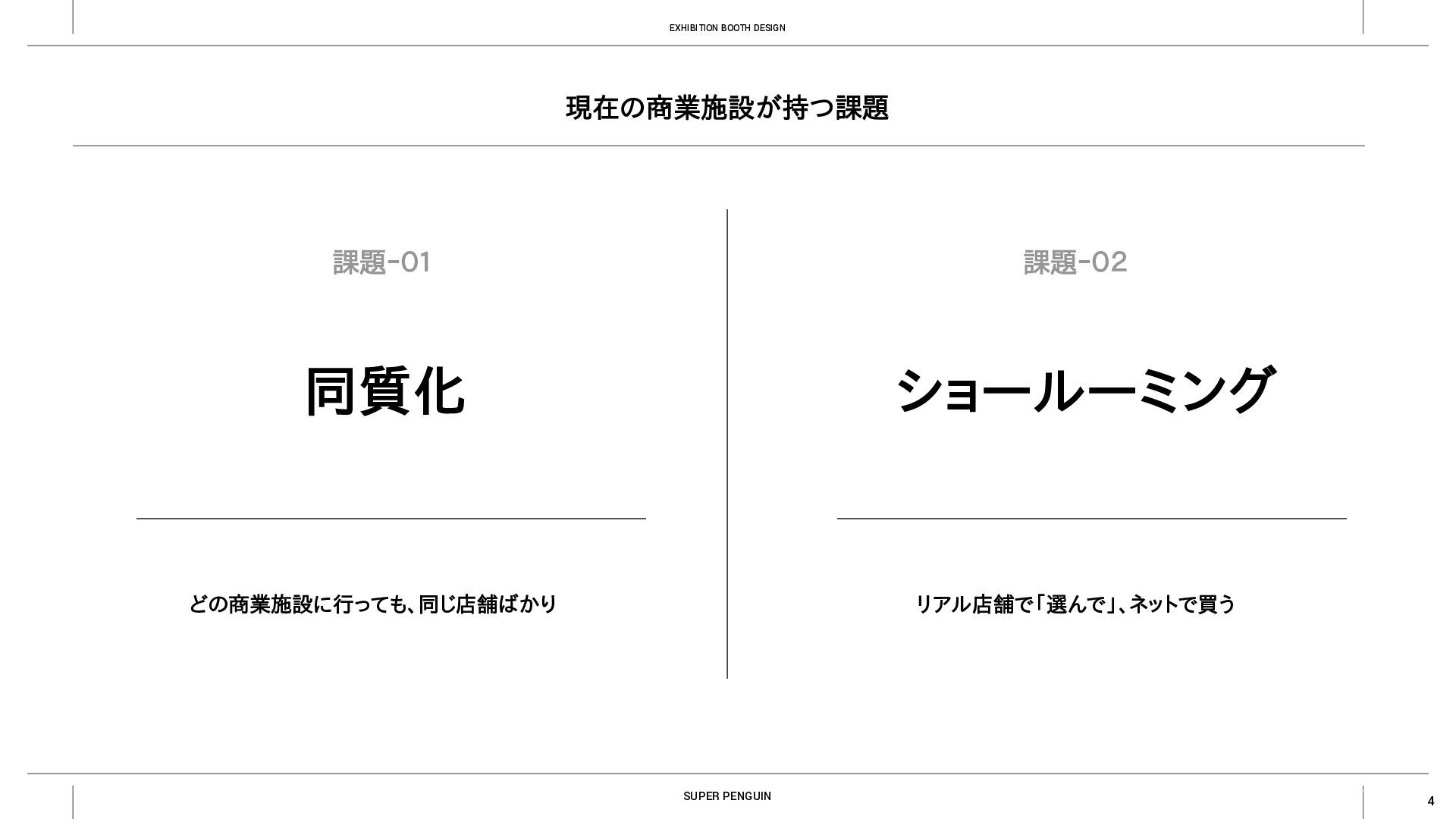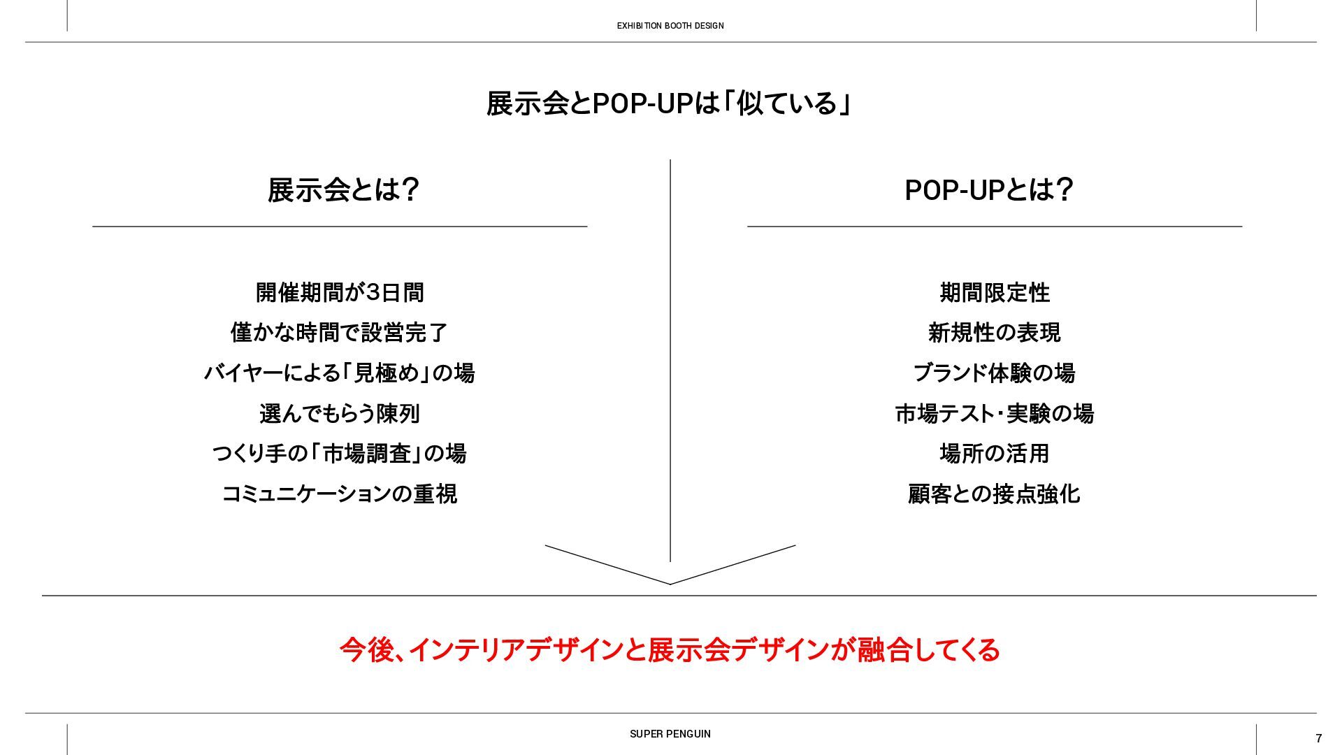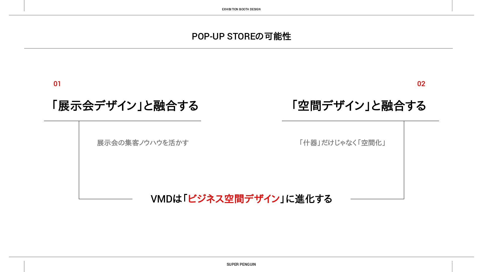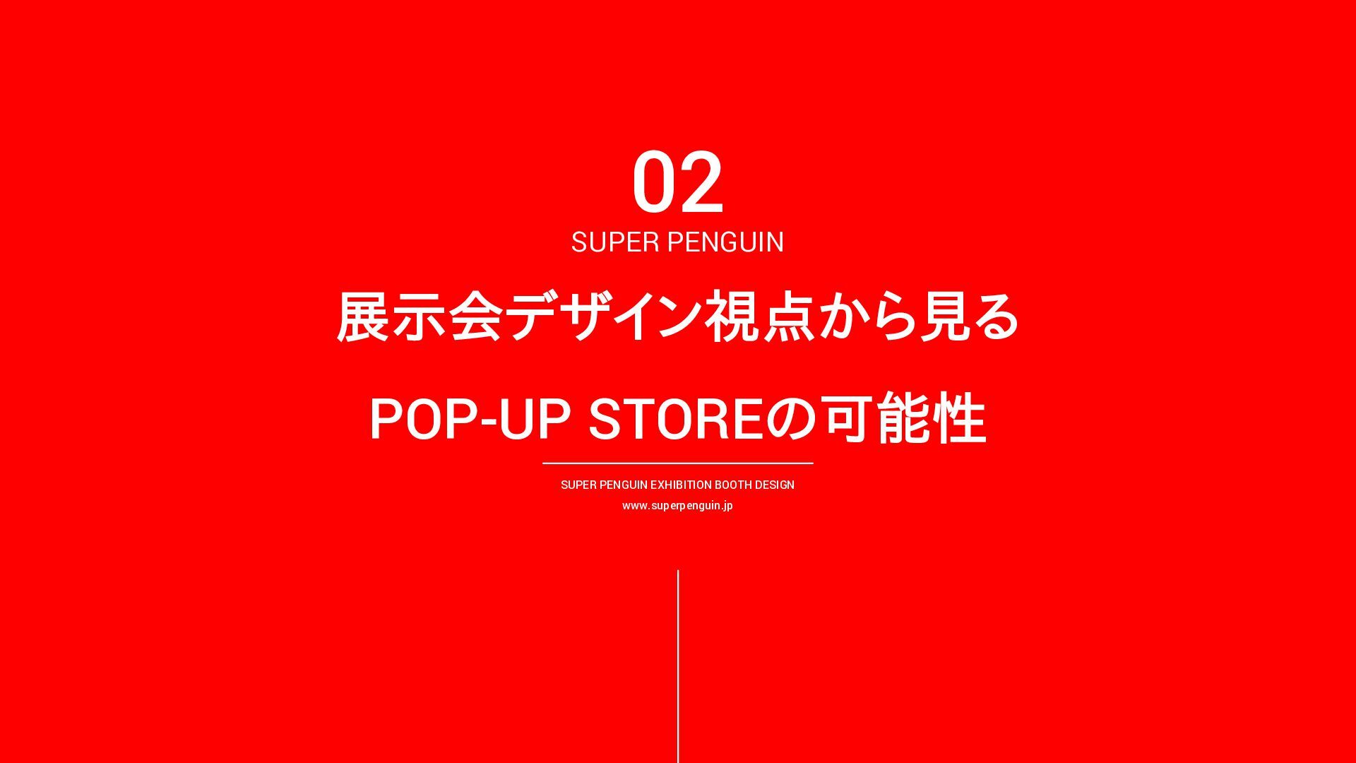 SUPERPENGUIN INC. ALL RIGHT RESERVED. POP-UP STOREの可能性 「展示会デザイン」と融合する 「空間デザイン」と融合する VMDは「ビジネス空間デザイン」に進化する 展示会の集客ノウハウを活かす 「什器」だけじゃなく「空間化」 01 02