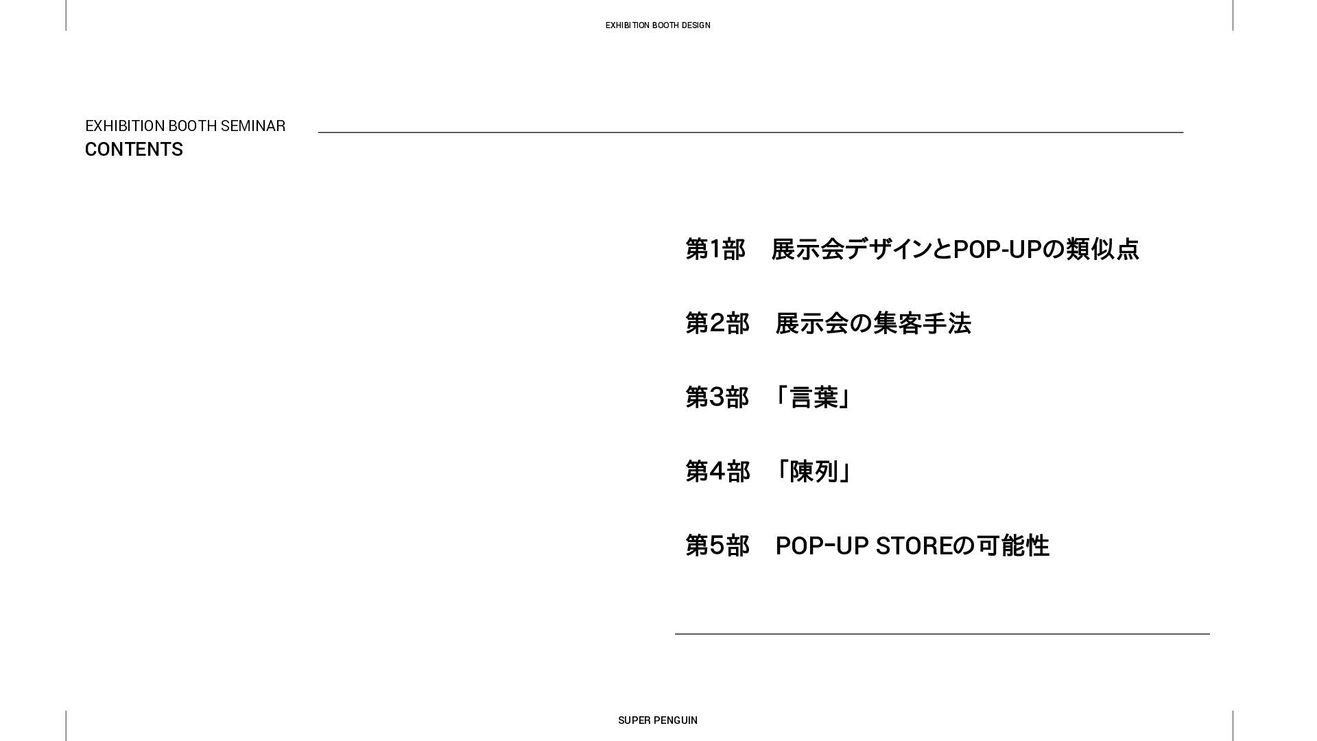 SUPER PENGUIN EXHIBITION BOOTH DESIGN 第1部 展示会デザインとPOP-UPの類似点 第2部 展示会の集客手法 第3部