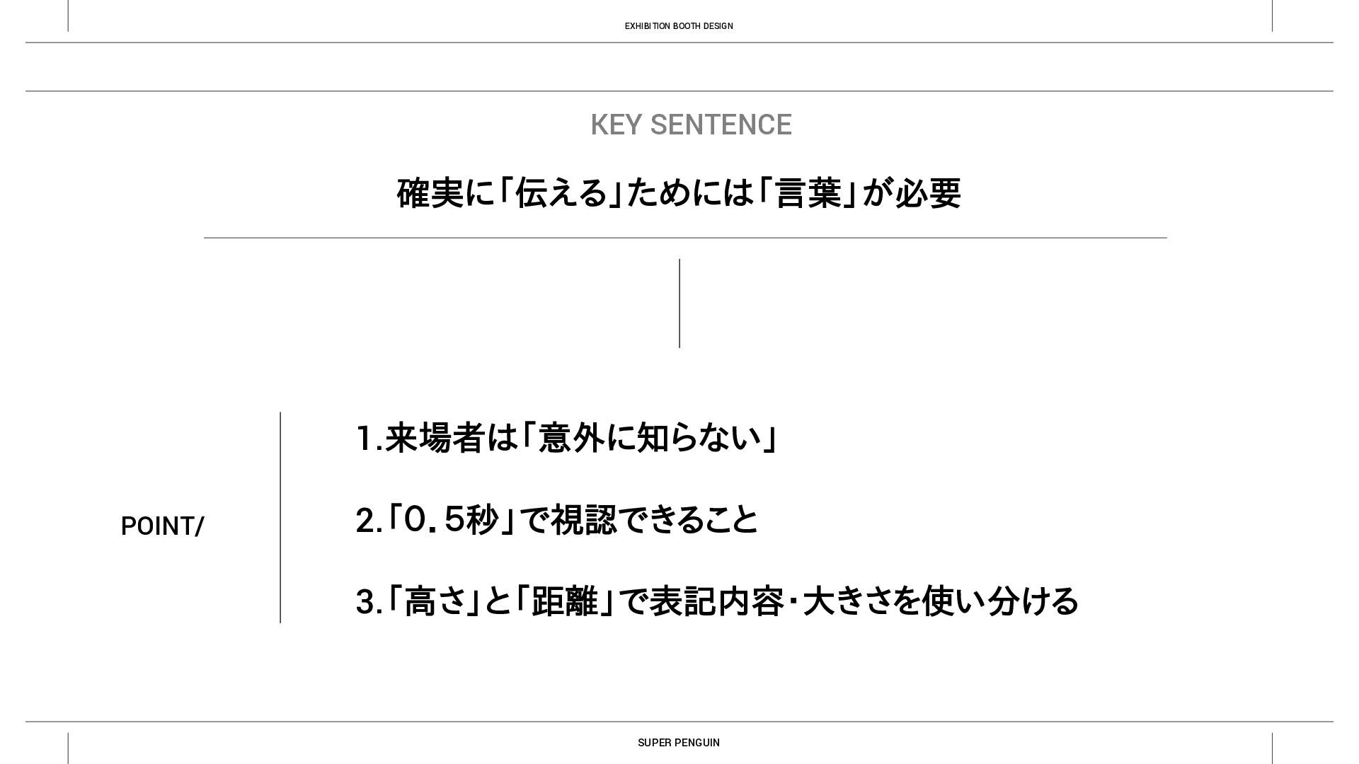 SUPER PENGUIN EXHIBITION BOOTH DESIGN 確実に「伝える」ためには「言葉」が必要 1.来場者は「意外に知らない」 2.「0.5秒」で視認できること 3.「高さ」と「距離」で表記内容・大きさを使い分ける POINT/