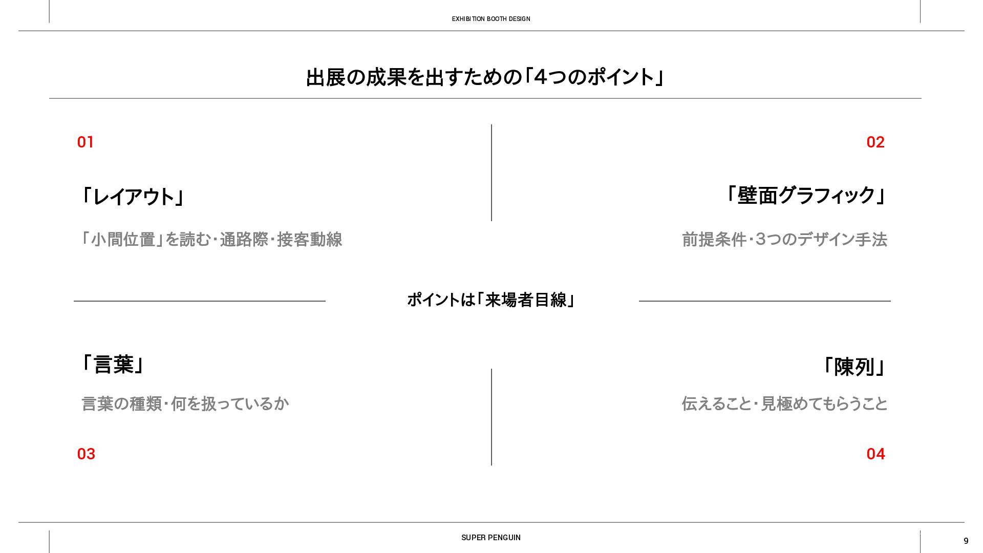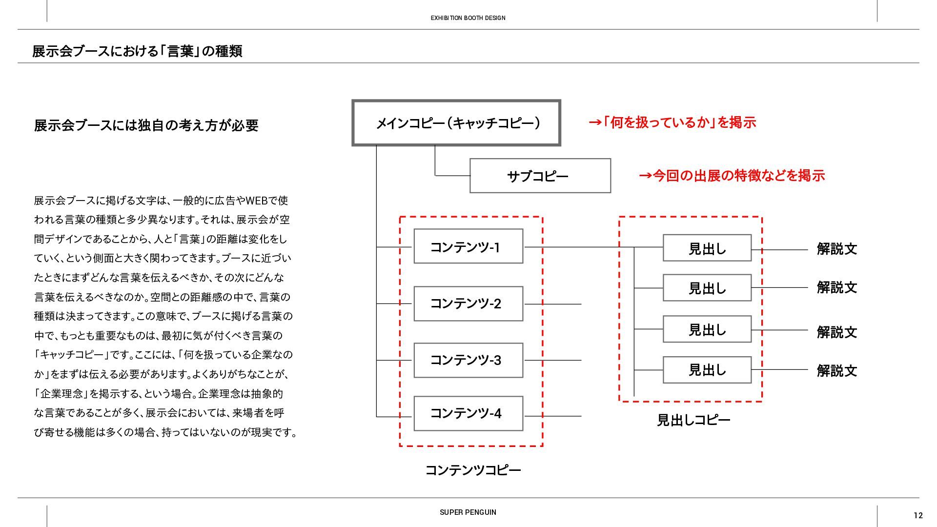 SUPER PENGUIN EXHIBITION BOOTH DESIGN 12 展示会ブースにおける「言葉」の種類 メインコピー(キャッチコピー) 見出し コンテンツ-1