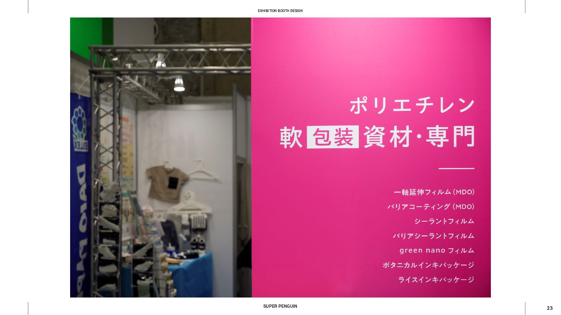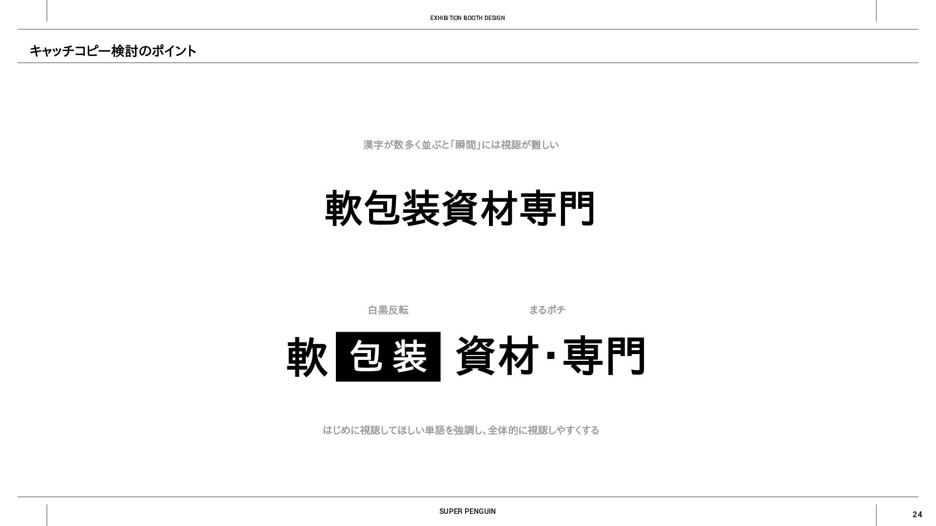 SUPER PENGUIN EXHIBITION BOOTH DESIGN 24 漢字が数多く並ぶと「瞬間」には視認が難しい 軟包装資材専門 キャッチコピー検討のポイント 包