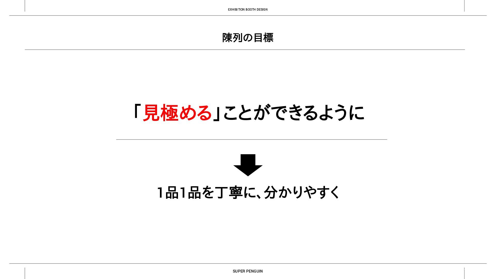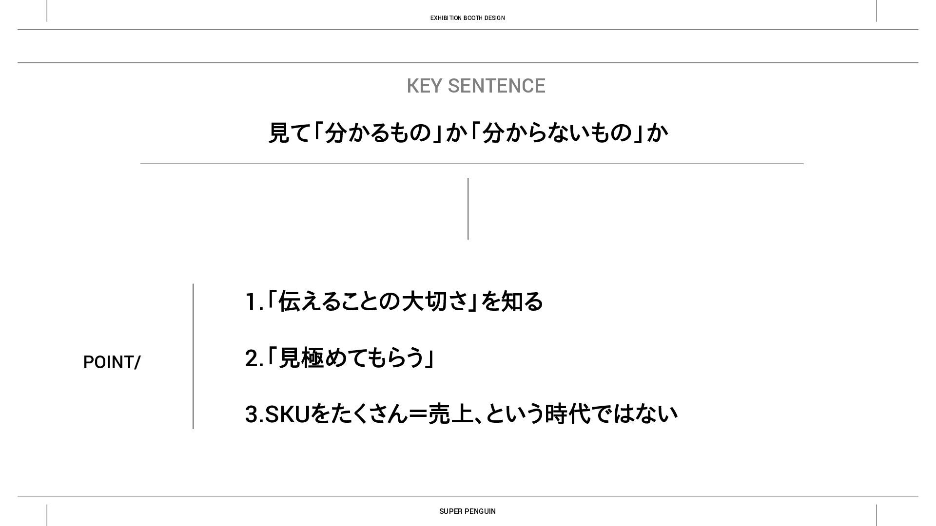 SUPER PENGUIN EXHIBITION BOOTH DESIGN 見て「分かるもの」か「分からないもの」か 1.「伝えることの大切さ」を知る 2.「見極めてもらう」 3.SKUをたくさん=売上、という時代ではない POINT/