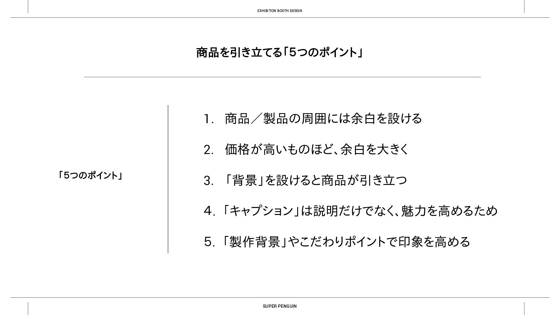 SUPER PENGUIN EXHIBITION BOOTH DESIGN 商品を引き立てる「5つのポイント」 1. 商品/製品の周囲には余白を設ける 2. 価格が高いものほど、余白を大きく