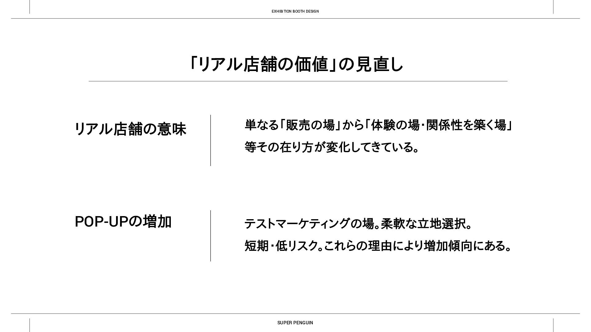 SUPER PENGUIN EXHIBITION BOOTH DESIGN 「リアル店舗の価値」の見直し リアル店舗の意味 POP-UPの増加 単なる「販売の場」から「体験の場・関係性を築く場」 等その在り方が変化してきている。