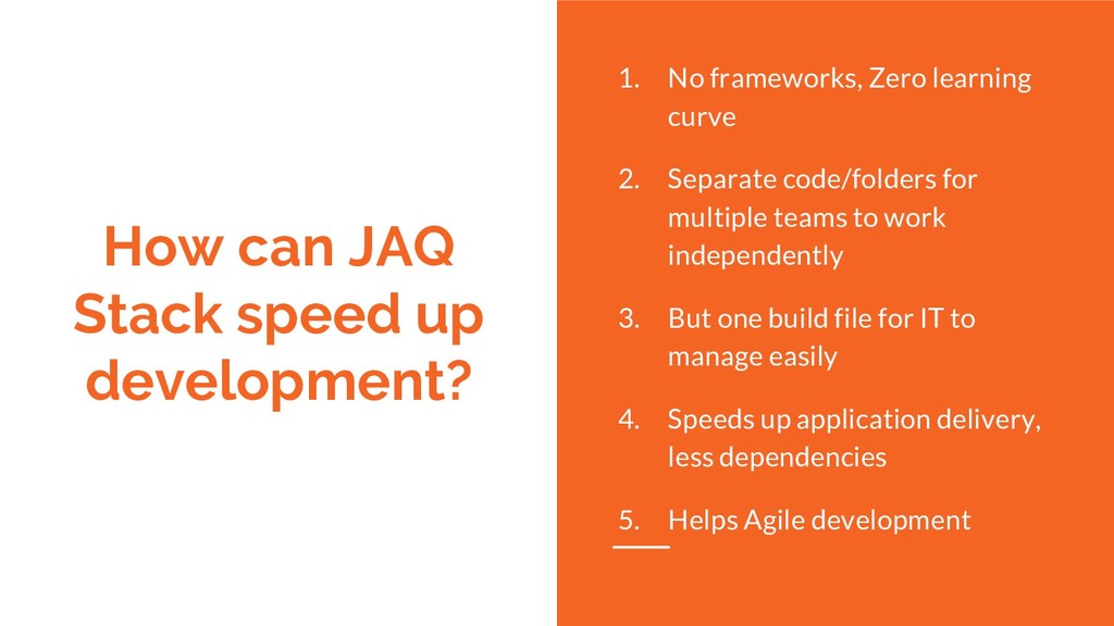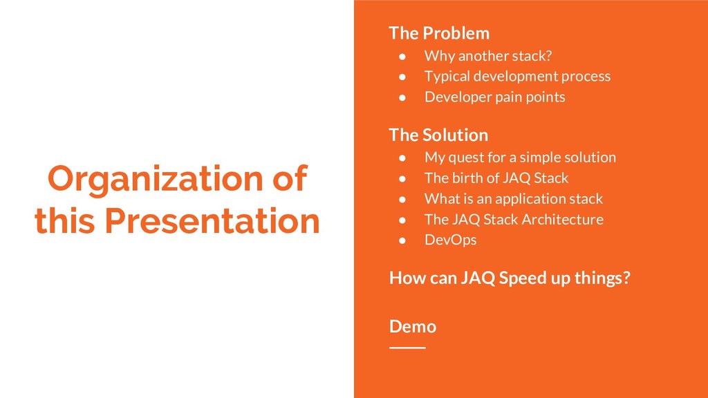 • Typical development process • Developer pain points The Solution • My quest for a simple solution • The birth of JAQ Stack • What is an application stack • The JAQ Stack Architecture • DevOps How can JAQ Speed up things? Demo