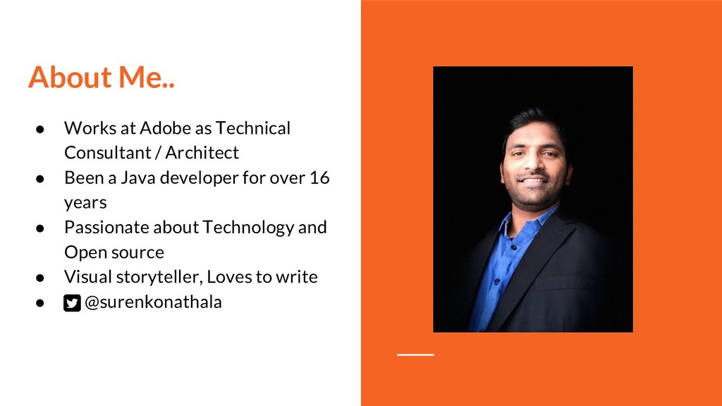 Architect • Been a Java developer for over 16 years • Passionate about Technology and Open source • Visual storyteller, Loves to write • @surenkonathala