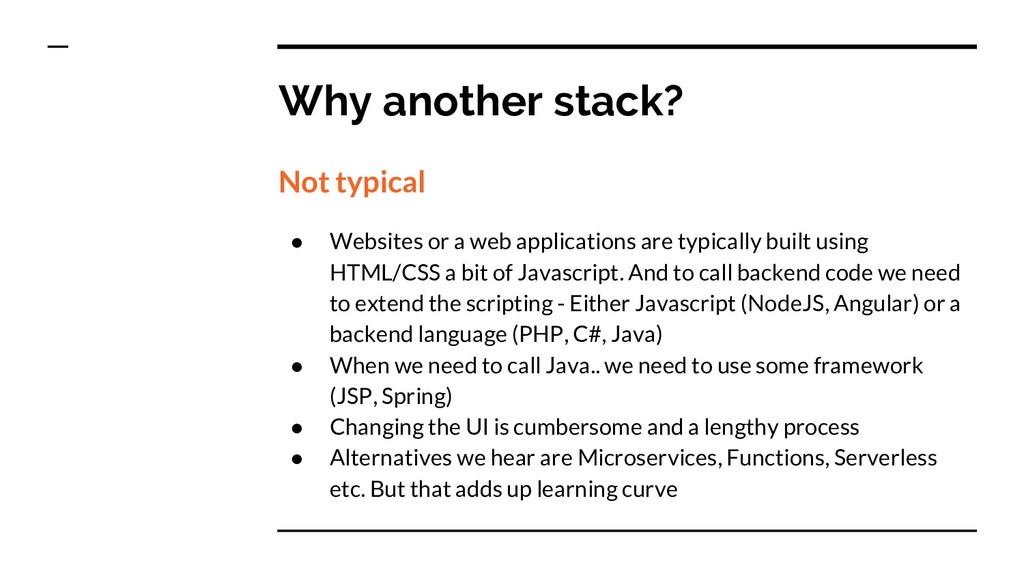 applications are typically built using HTML/CSS a bit of Javascript. And to call backend code we need to extend the scripting - Either Javascript (NodeJS, Angular) or a backend language (PHP, C#, Java) • When we need to call Java.. we need to use some framework (JSP, Spring) • Changing the UI is cumbersome and a lengthy process • Alternatives we hear are Microservices, Functions, Serverless etc. But that adds up learning curve