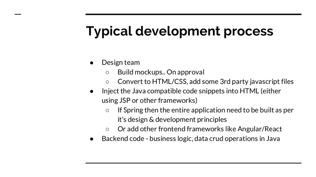 approval ◦ Convert to HTML/CSS, add some 3rd party javascript files • Inject the Java compatible code snippets into HTML (either using JSP or other frameworks) ◦ If Spring then the entire application need to be built as per it’s design & development principles ◦ Or add other frontend frameworks like Angular/React • Backend code - business logic, data crud operations in Java