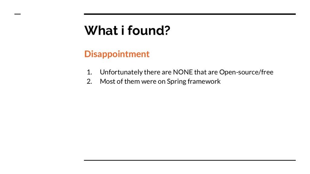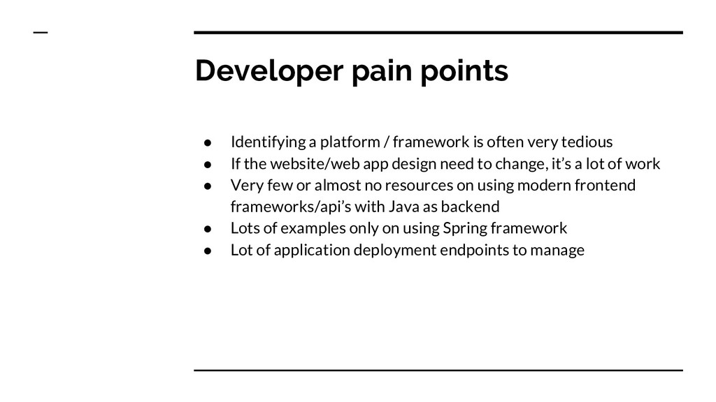 often very tedious • If the website/web app design need to change, it’s a lot of work • Very few or almost no resources on using modern frontend frameworks/api’s with Java as backend • Lots of examples only on using Spring framework • Lot of application deployment endpoints to manage