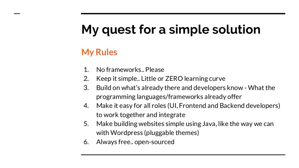 frameworks.. Please 2. Keep it simple.. Little or ZERO learning curve 3. Build on what’s already there and developers know - What the programming languages/frameworks already offer 4. Make it easy for all roles (UI, Frontend and Backend developers) to work together and integrate 5. Make building websites simple using Java, like the way we can with Wordpress (pluggable themes) 6. Always free.. open-sourced